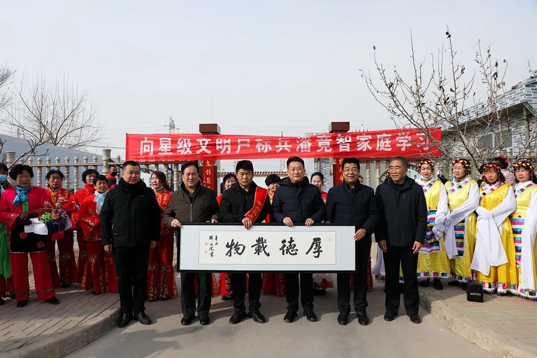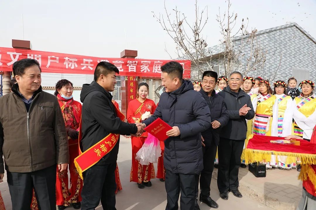 1月28日上午,金川区宁远堡镇中牌村锣鼓喧天,好不热闹。踏着轻快的锣鼓声,秧歌队和舞狮队吸引了村民们的注意,区委书记张恒山,区人大常委会主任田世伦,区政协主席王世江,区委常委、宣传部部长梁艇栋为获得“金川区2021年度星级文明户标兵”的潘竟智家庭进行现场颁奖挂牌,赠送书画作品和荣誉证书。