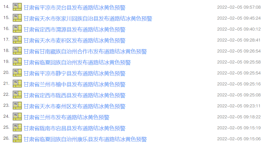 兰州市气象台2022年2月5日9时18分发布道路结冰黄色预警信号:受降雪天气影响,预计24小时内全市大部将出现道路结冰,请注意防范!