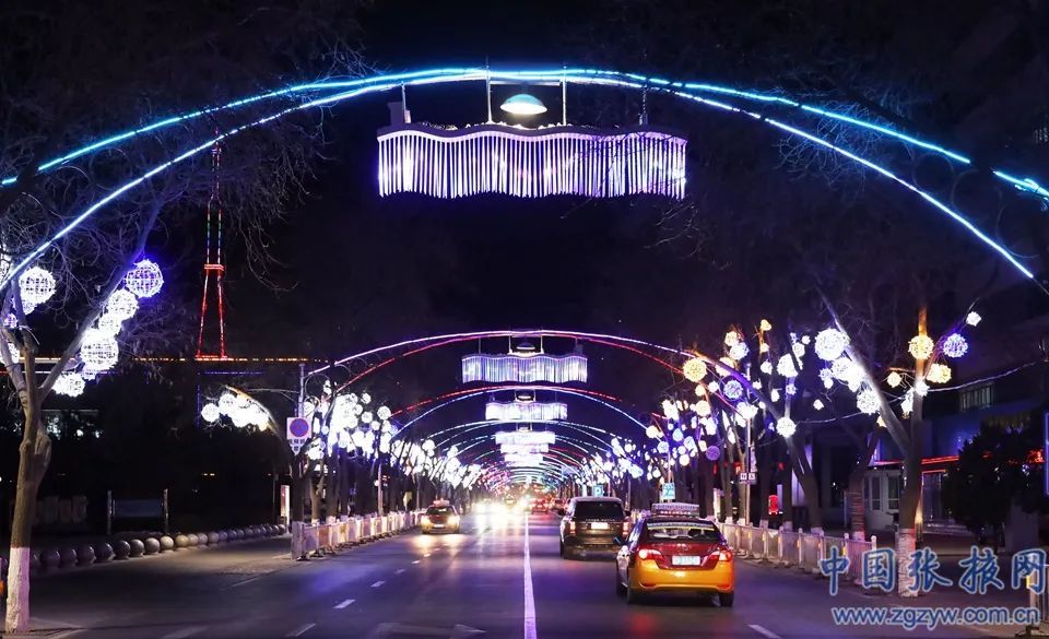 城区道路除了主干道的树上挂满了形状各异的灯彩,路边绿化带上也挂上了小小的五色彩灯。在大佛寺景区、滨河新区等路段,都以不同的主题,悬挂各色彩灯,整个城市流光溢彩,分外美丽。