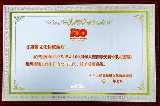 2021年6月28日晚,在党的百年华诞之际,庆祝中国共产党成立100周年文艺演出——大型情景史诗《伟大征程》在国家体育场盛大举行。演出共分为四个篇章,综合运用多种艺术手段,生动展现中国共产党百年来带领中国人民进行革命、建设、改革的壮美画卷,热情讴歌党的十八大以来,中国特色社会主义进入新时代,昂首阔步迈向全面建设社会主义现代化国家的新征程。整场演出以史诗的美学品格以及巨大的艺术感染力,展现了中国共产党百年奋斗的光辉历程,反响热烈,好评如潮。2021年7月,文化和旅游部对甘肃省文化和旅游厅、山东省文化和旅游厅等单位进行通报表扬,并颁发了奖牌。