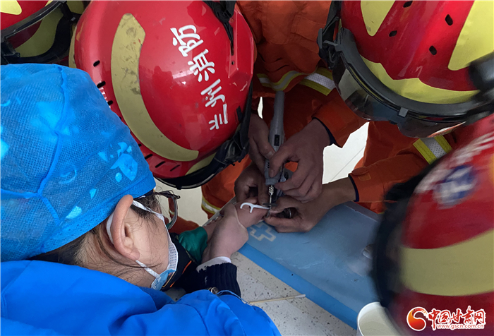 中国甘肃网2月16日讯(本网记者 程健)2月16日上午,兰州市皋兰县一名小孩手指被金属夹子孔卡住,由于担心孩子受伤,医院又无法取出,家长和医院随即报警求助。接到警情后,石洞消防站消防员立即出动,并成功施救。