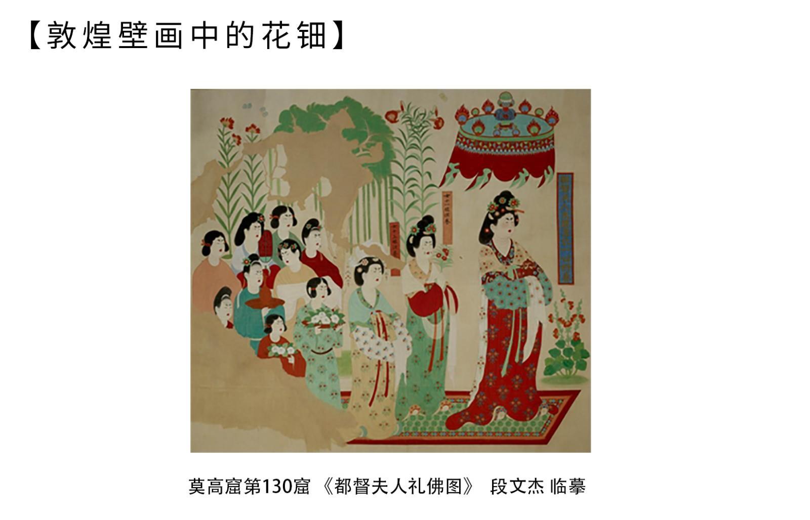 莫高窟第61窟主室北壁五代女供养人额上髻侧、两颊、两腮均饰有钿花,同窟东壁南侧北宋时节度使曹延禄夫人、于阗公主李氏更是满面贴花点绿。