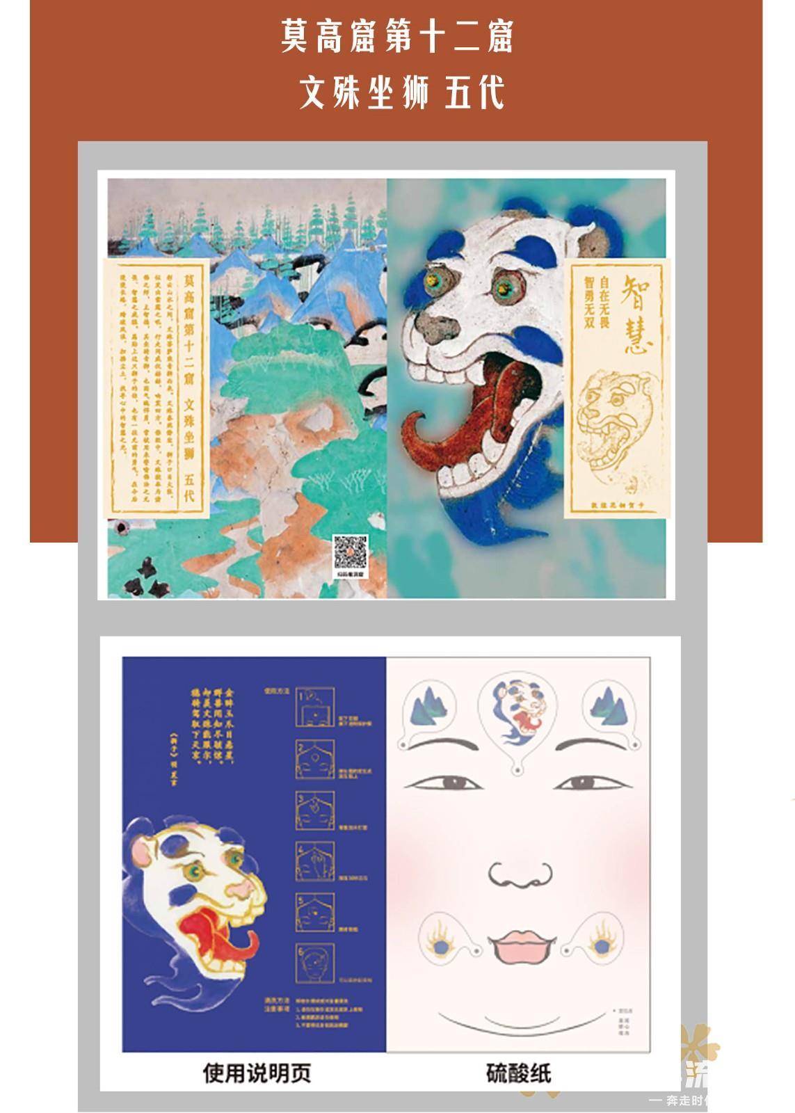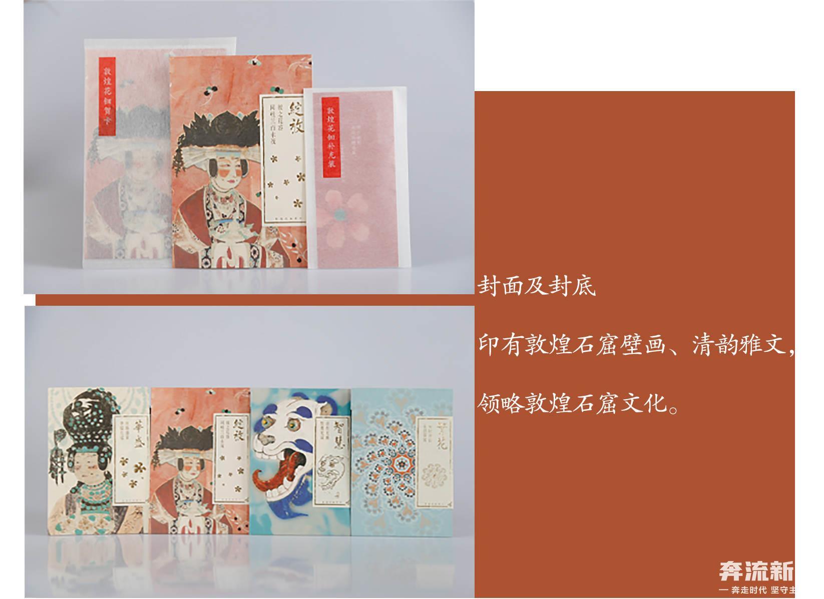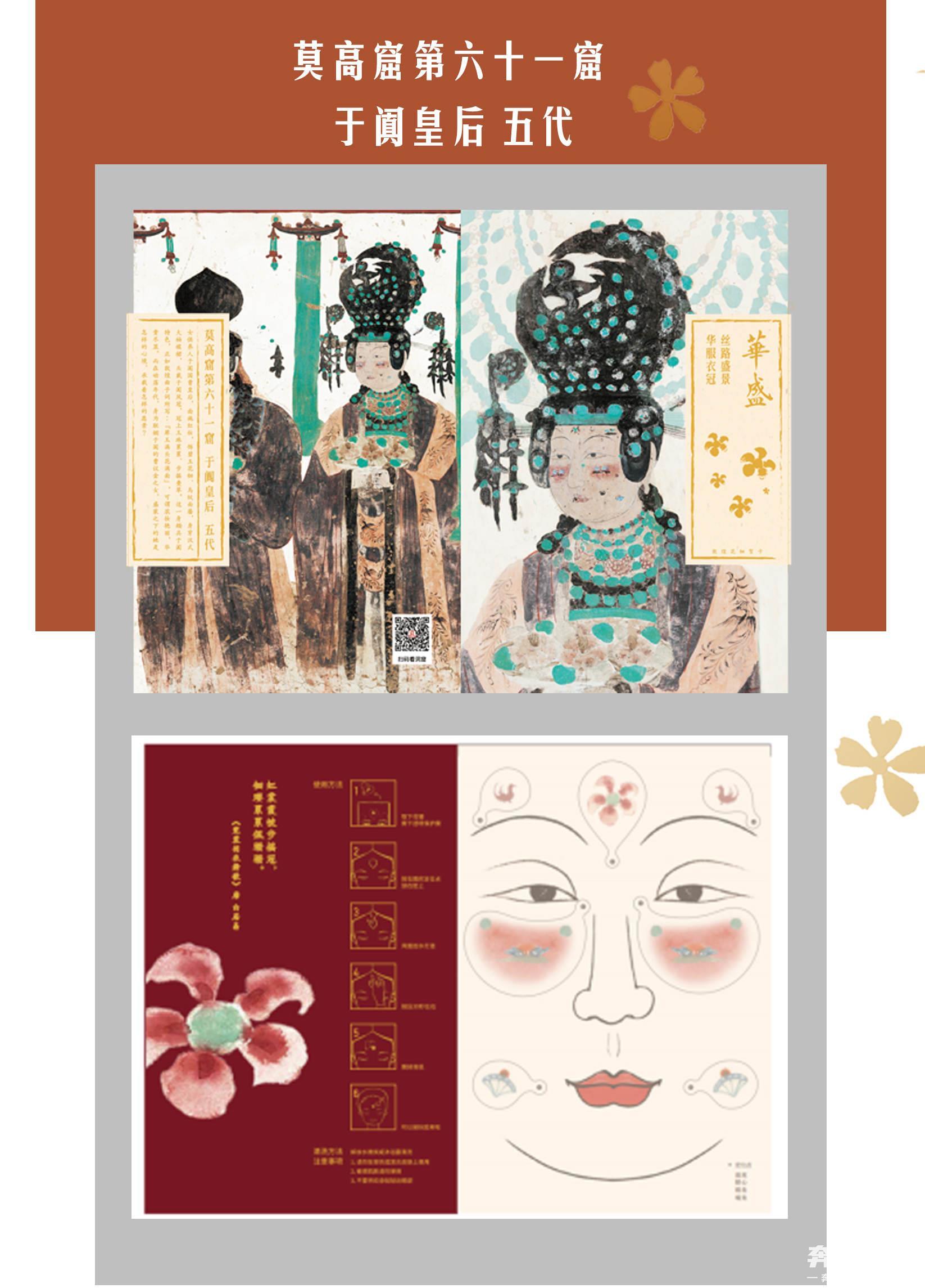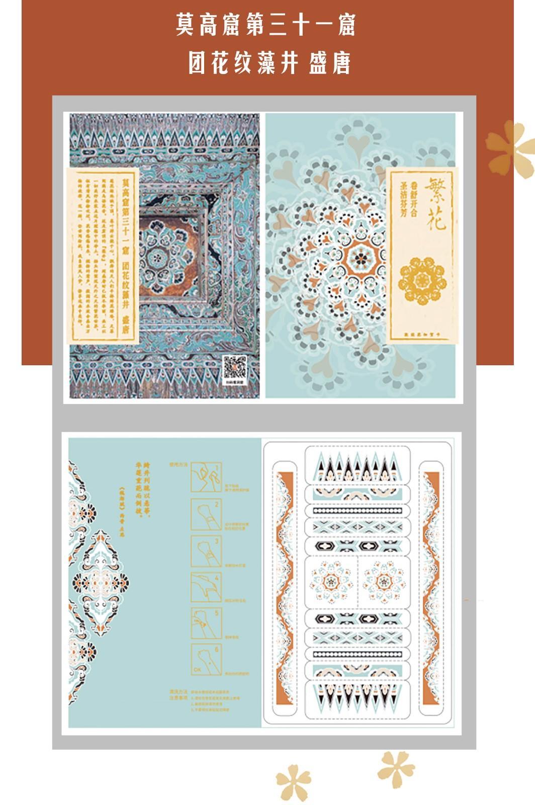 敦煌花钿贺卡以讲故事的方式,根据敦煌文献中书仪样式设计,外观古朴典雅,书写美好祝福。封面及封底印有敦煌石窟壁画、清韵雅文,可以领略敦煌石窟文化。册页以敦煌色为底,介绍使用方法,手绘线稿,让贴花钿的过程清楚明了且具有仪式感。扫描二维码,还可畅游“数字敦煌”,探寻更多壁画背后的故事。