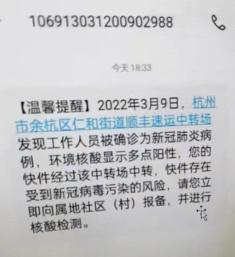 3月6日以来,收到杭州市余杭区仁和街道顺丰速运中转场发来快递或收到温馨提醒的居民(见附图),请立即向金川区疾控中心或所在镇(村)、街道(社区)报备。