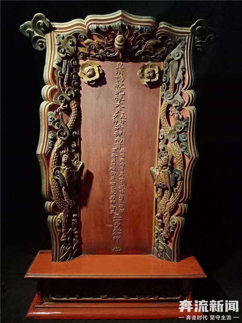 据了解,村民家中保存的有清版慕天颜文集《楚黔封事》上卷、《抚吴封事》一至八册(二、九两册遗失)及家谱序言等文字资料。一同发现的还有慕天颜牌位,高约80厘米、宽约60厘米,两侧木质减地浮雕髹漆,工艺独特,牌位正中竖排阳刻51个镏金字。正中一行字迹较大,共有23个字:皇清诰授光禄大夫太子少师兵部尚书正一品慕公神位;左右两边字体略小,共28个字,左:军务监理粮饷兼都察院右都御史;右:总督淮扬等处地方提督漕运海防。