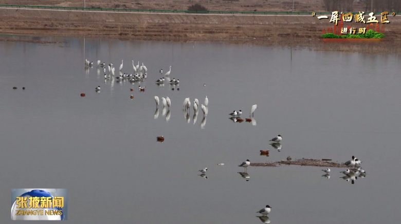 初春的山丹县祁家店水库,成群的白鹭、野鸭等在这里栖息,与波光粼粼的水面构成了一幅和谐美妙的生态画卷。