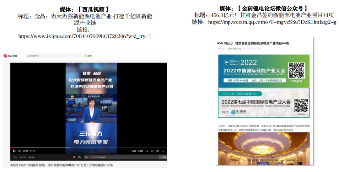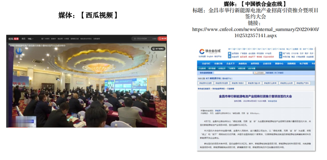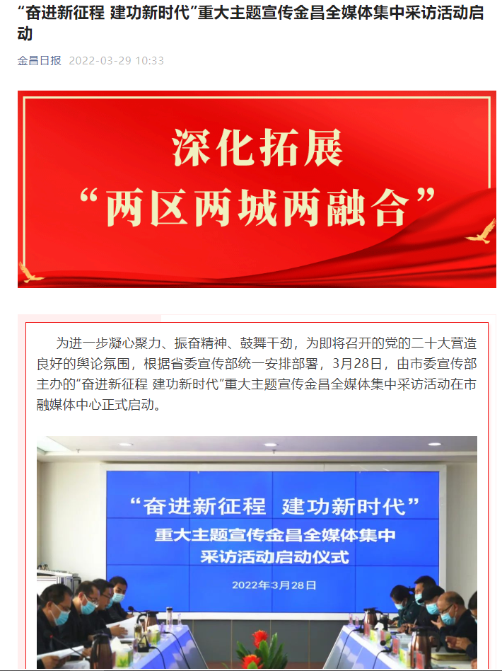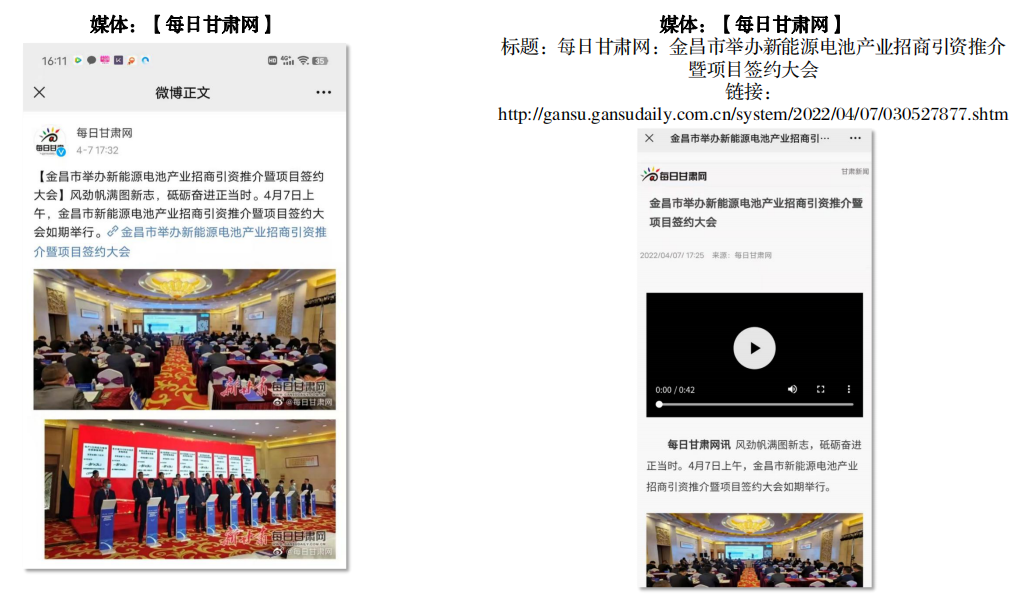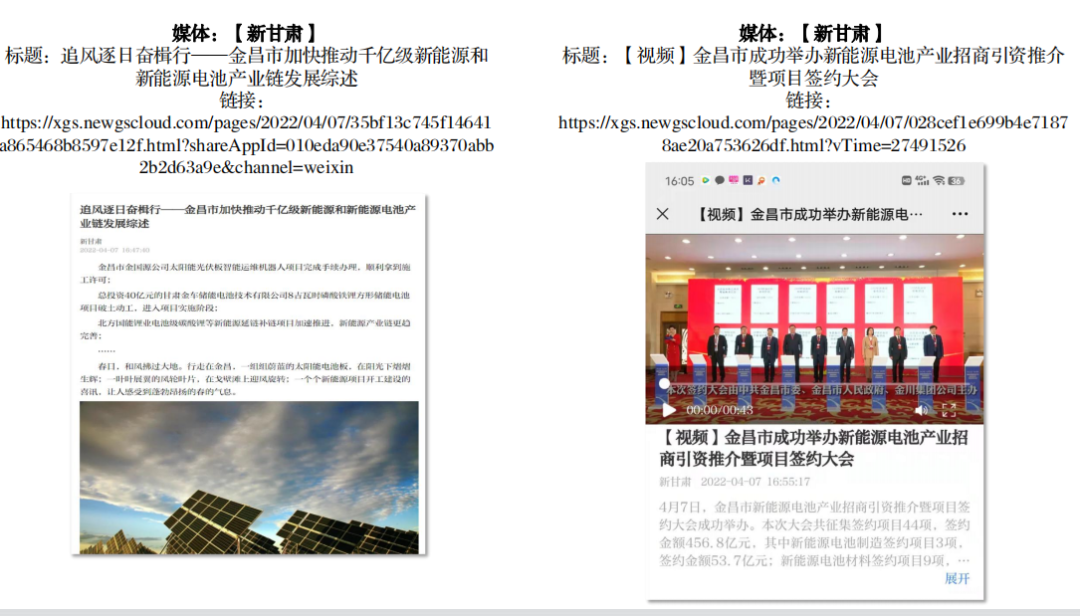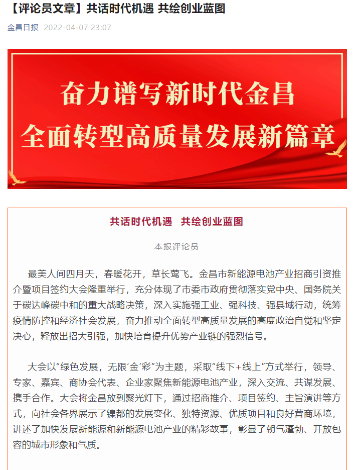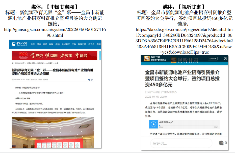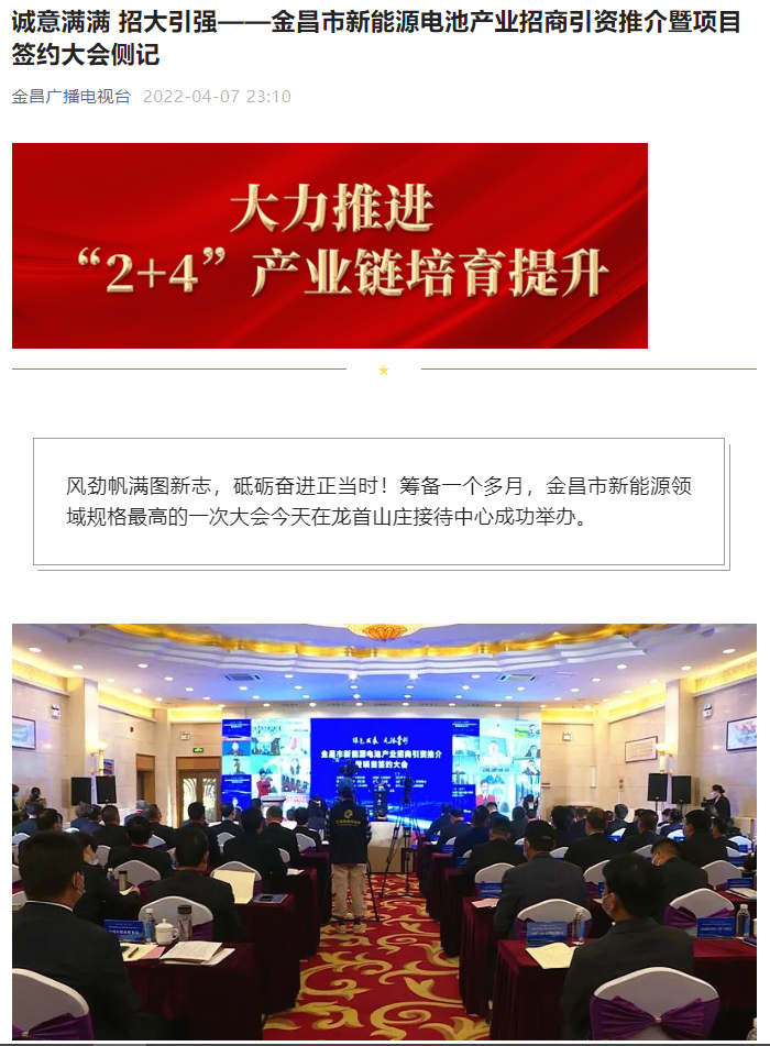 金昌日报、金昌广播电视台刊发重点稿件:《追风逐日奋楫行——金昌市加快推动千亿级新能源和新能源电池产业链发展综述》;评论员文章《共话时代机遇 共绘创业蓝图》;《新能源孕育无限“金”彩——金昌市新能源电池产业招商引资推介暨项目签约大会侧记》。