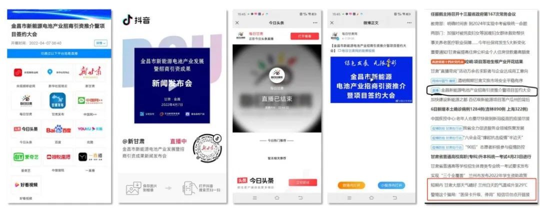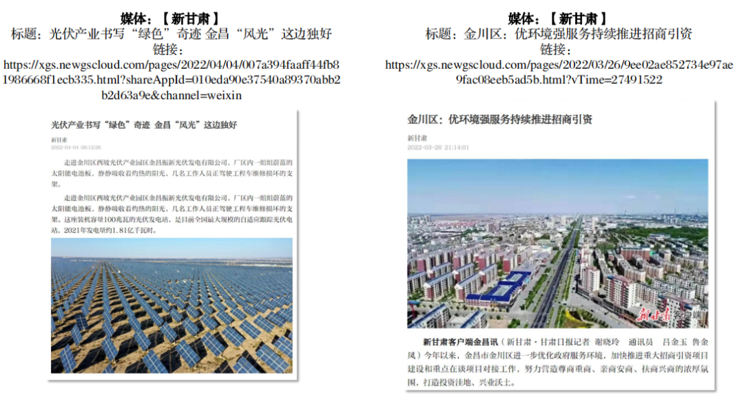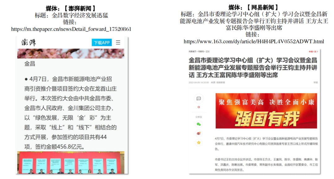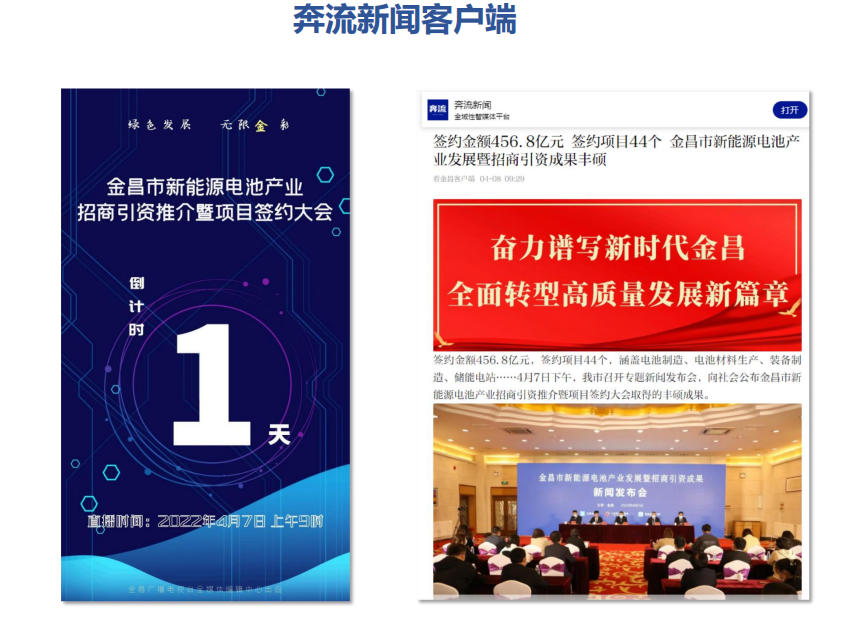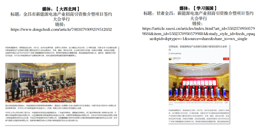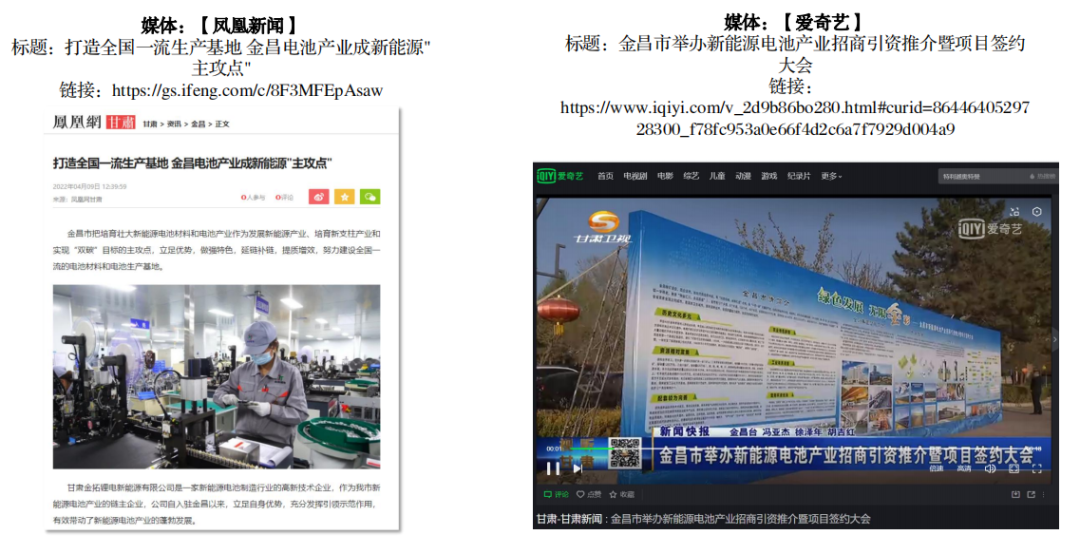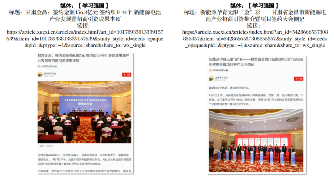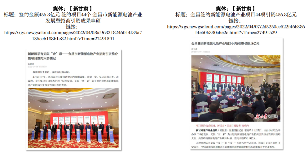 金昌日报、金昌广播电视台刊发重点稿件:《追风逐日奋楫行——金昌市加快推动千亿级新能源和新能源电池产业链发展综述》;评论员文章《共话时代机遇 共绘创业蓝图》;《新能源孕育无限“金”彩——金昌市新能源电池产业招商引资推介暨项目签约大会侧记》。
