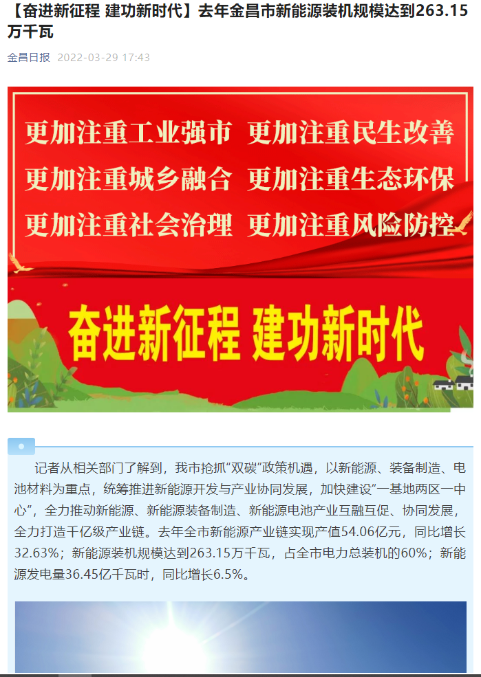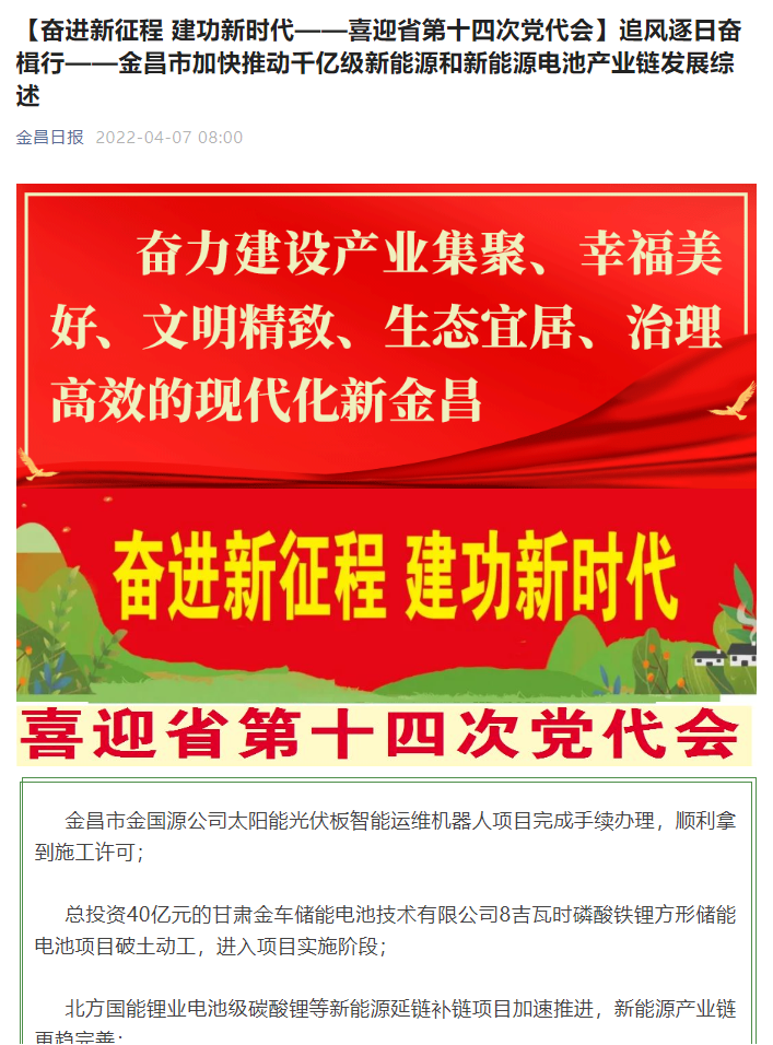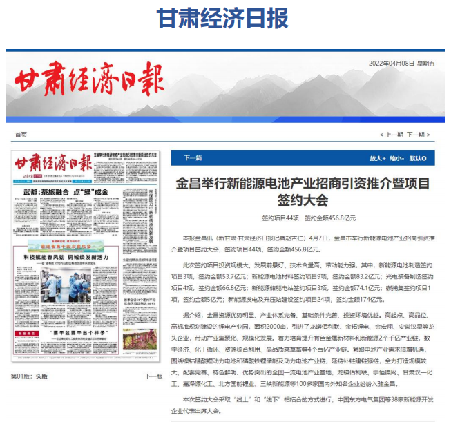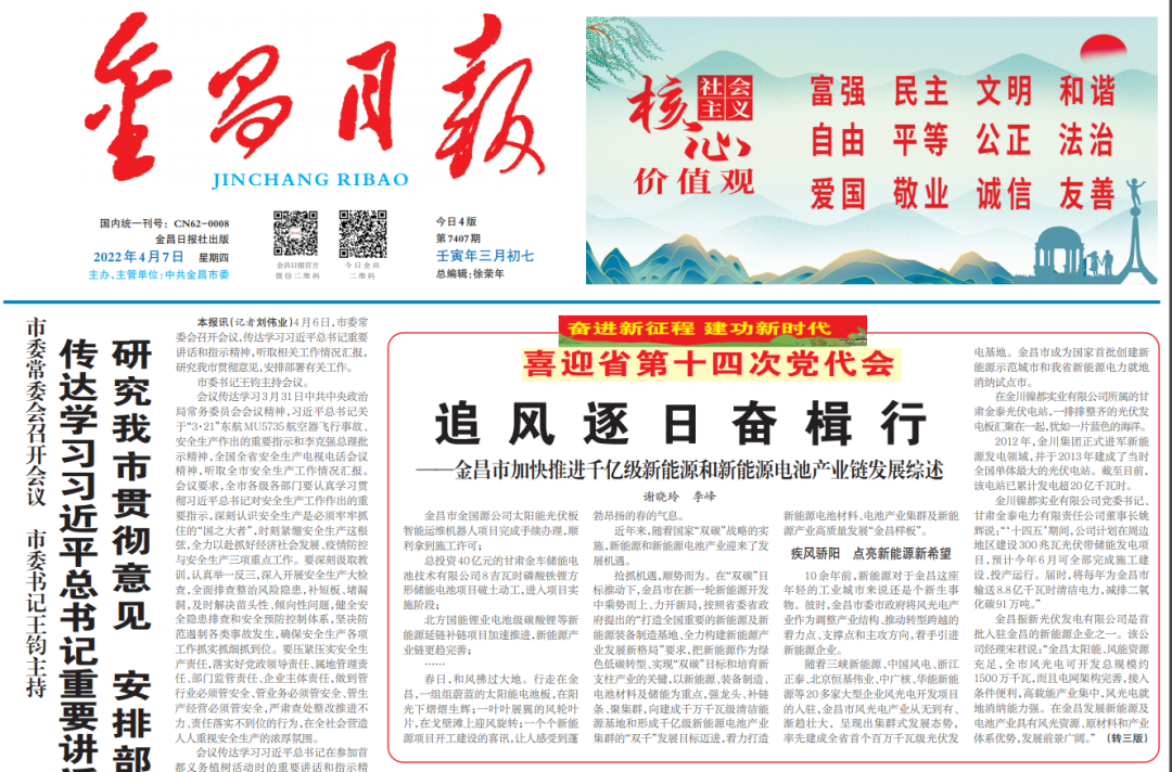 甘肃日报在4月6日刊发专版《金昌加快推进千亿级新能源和新能源电池产业链发展综述》