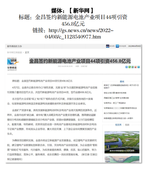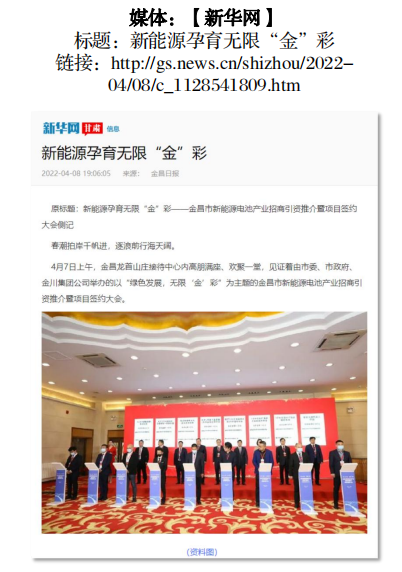 新华网刊发《签约金额456.8亿元 金昌市新能源电池产业发展暨招商引资成果丰硕》