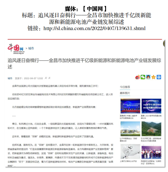 中国科技网刊发了《甘肃金昌:引资456亿元,为新能源电池产业发展增金添彩》