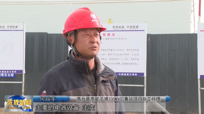 高台县高崖子滩330KV汇集站项目施工经理 何越丰:“主要的电器设备、主变,还有SVG的一些设备就位,完了以后电器安装随后跟进,在咱们项目部同仁的努力下,争取6月30号并网发电。”