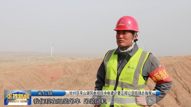 甘州区平山湖风电项目中电建宁夏工程公司现场总指挥 吴红银:“我们现在组装吊车、吊装风机,咱们13台风机6月12日之前应该是能整体完工。”