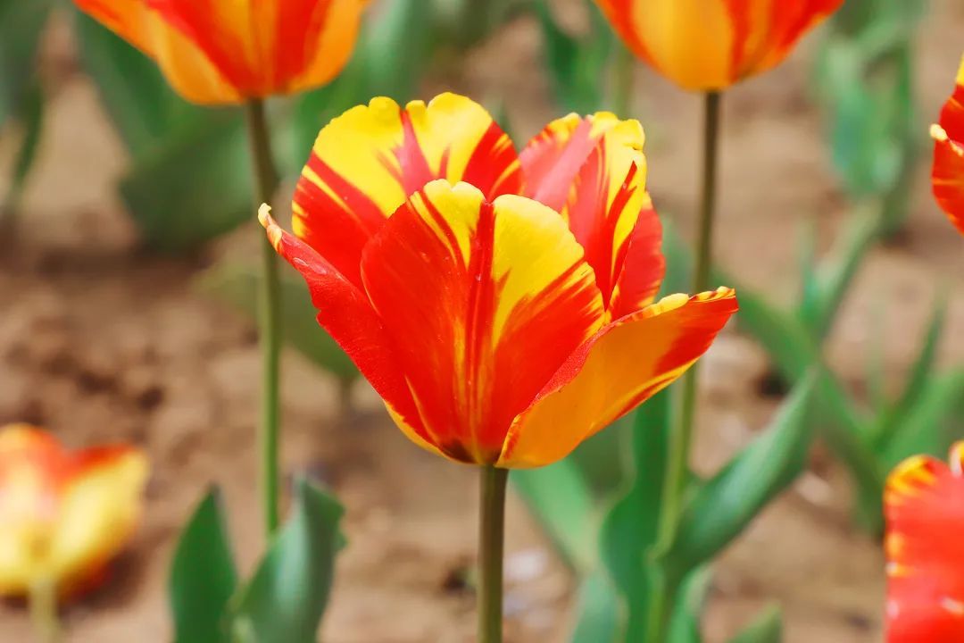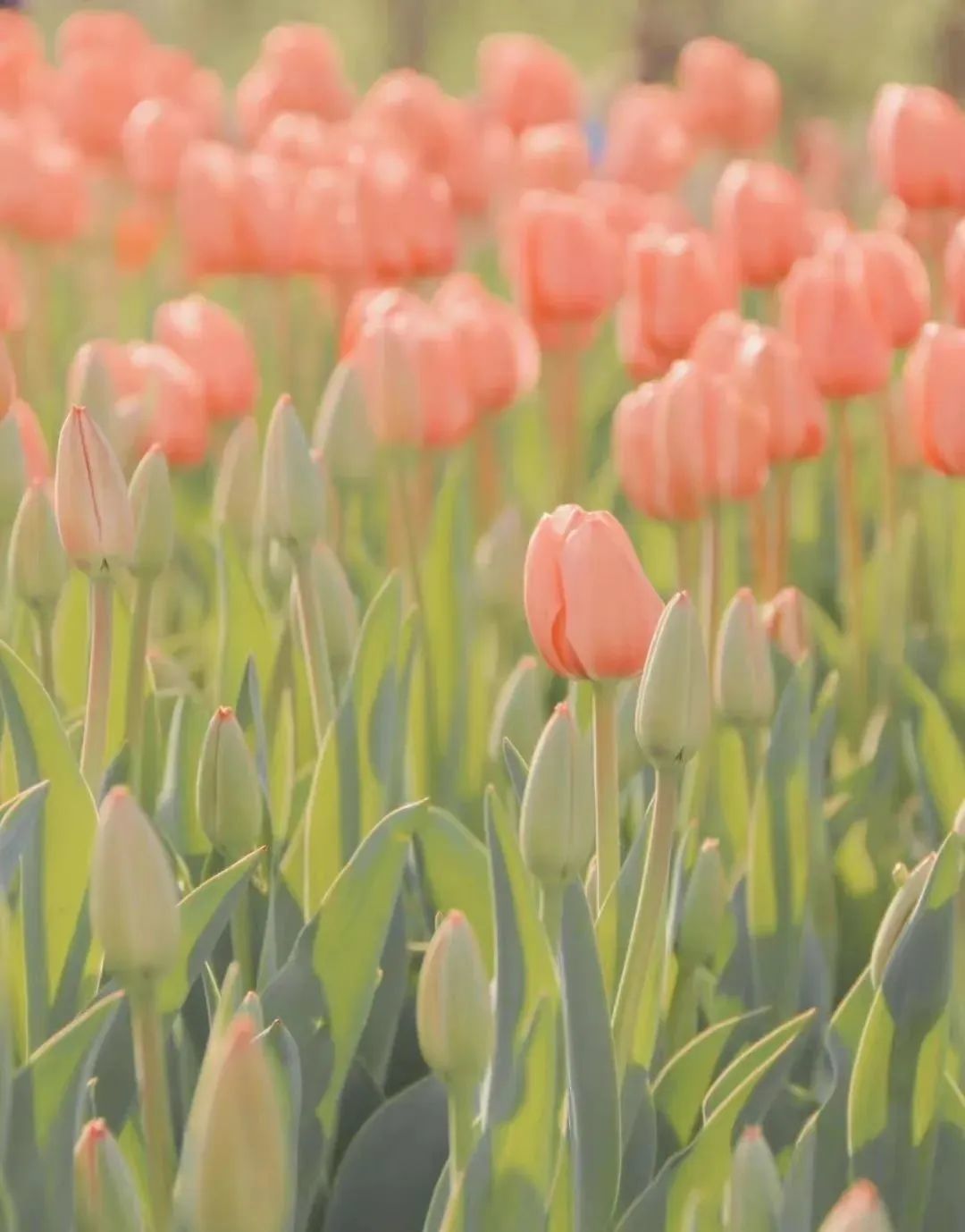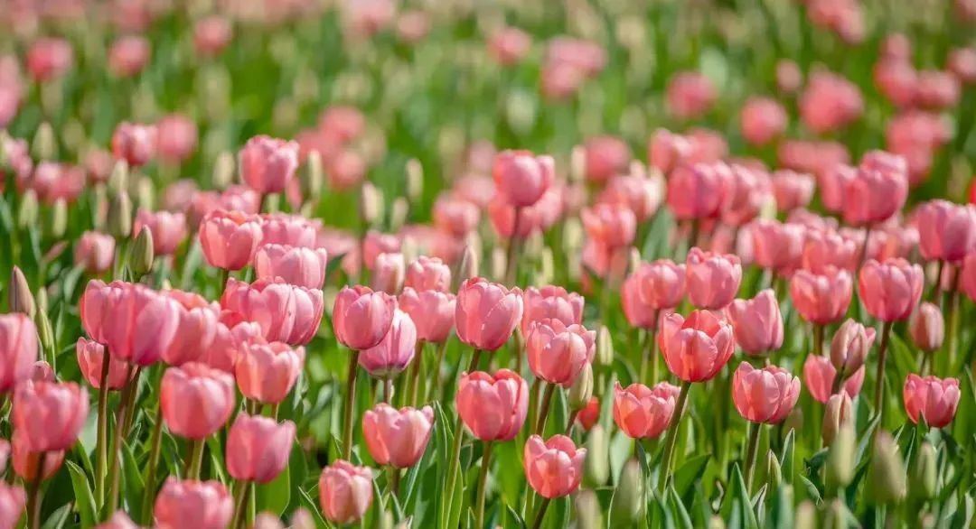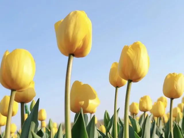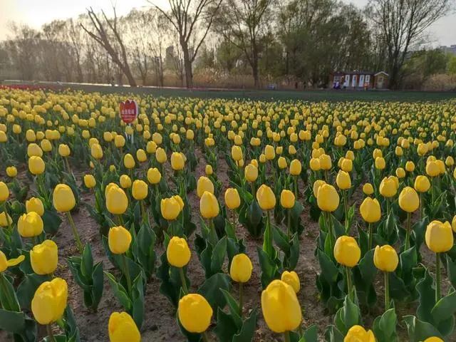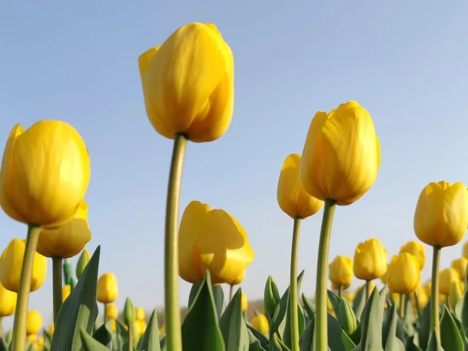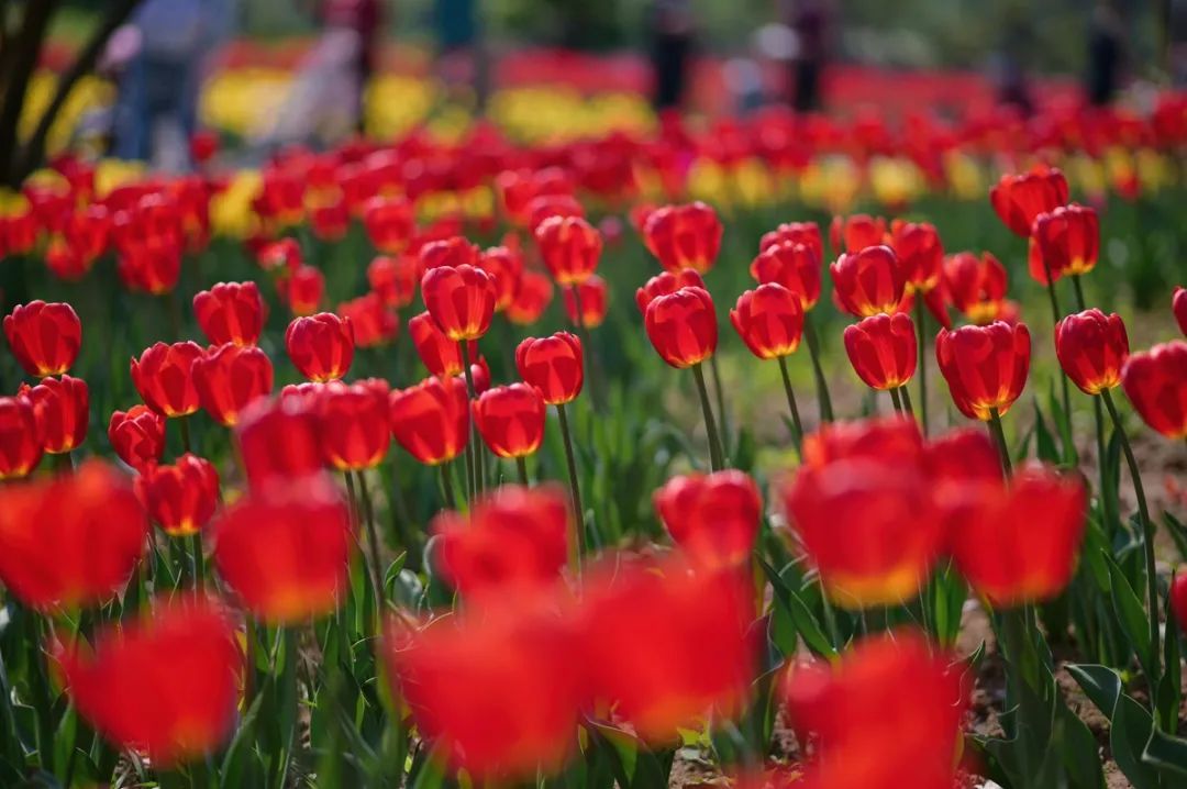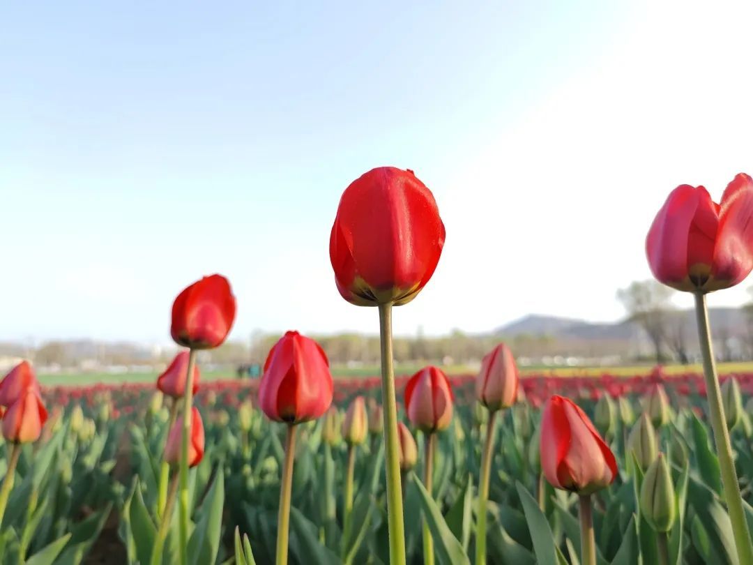 从远处望去,郁金香整整齐齐地排列着,阵阵微风吹过,摇曳生姿。