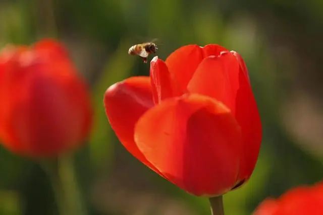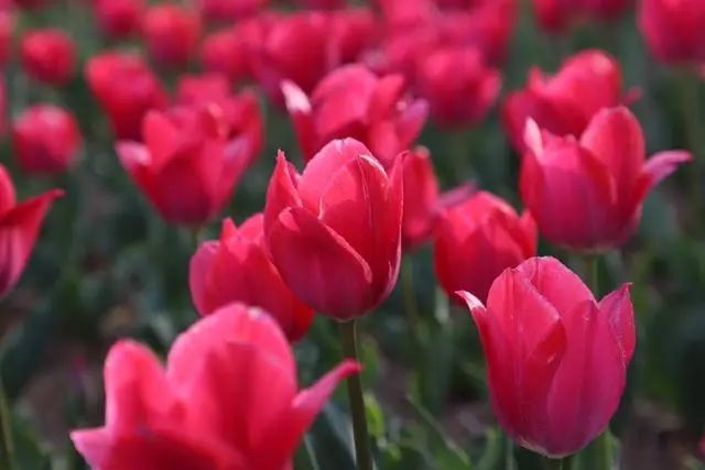 凑近看,郁金香花一朵挨着一朵,花瓣重叠,鲜艳得像要滴出水来。时不时还有几只蝴蝶蜜蜂萦绕在花间,享受着春天带来的丝丝甜蜜。
