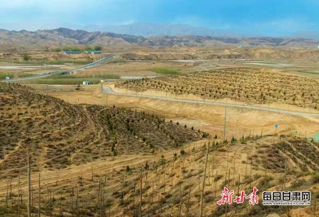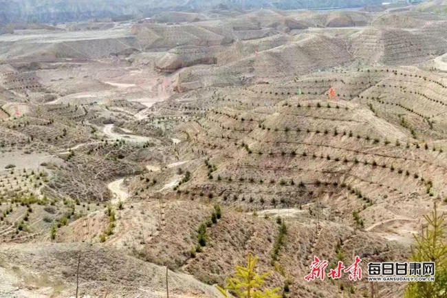 在国家储备林宝积镇大湾片区,记者看到周围一望无际的山峁沟壑已经栽种上了各种树木,昔日荒芜的山体已初显新绿。