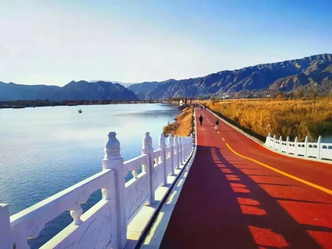 从太极岛岸边可以看到鱼塘里水波清澈、碧漪涟涟,一派江南景象。在这里,不仅可以领略“红山白土头,黄河向西流”的独特景观,还可以漫步在景观栈道,欣赏随风摇曳的芦苇荡,体验人在画中游的惬意悠闲。