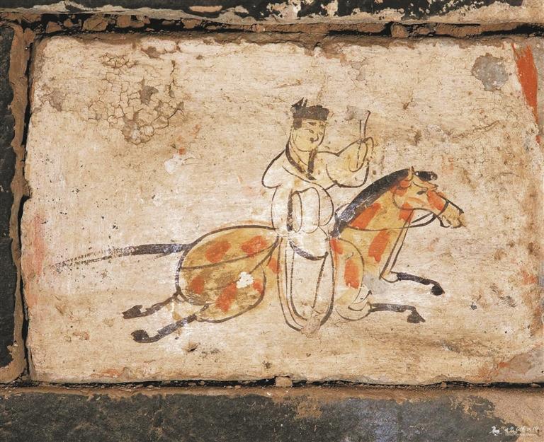 嘉峪关市魏晋5号墓出土,壁画砖长35厘米,宽17厘米。砖上绘一信使,头戴黑帻,着皂缘领袖中衣,左手持棨传文书,跃马疾驰。棨传为通过关卡、驿站时的信物。驿马四蹄腾空,奔驰在戈壁绿洲的道路上。