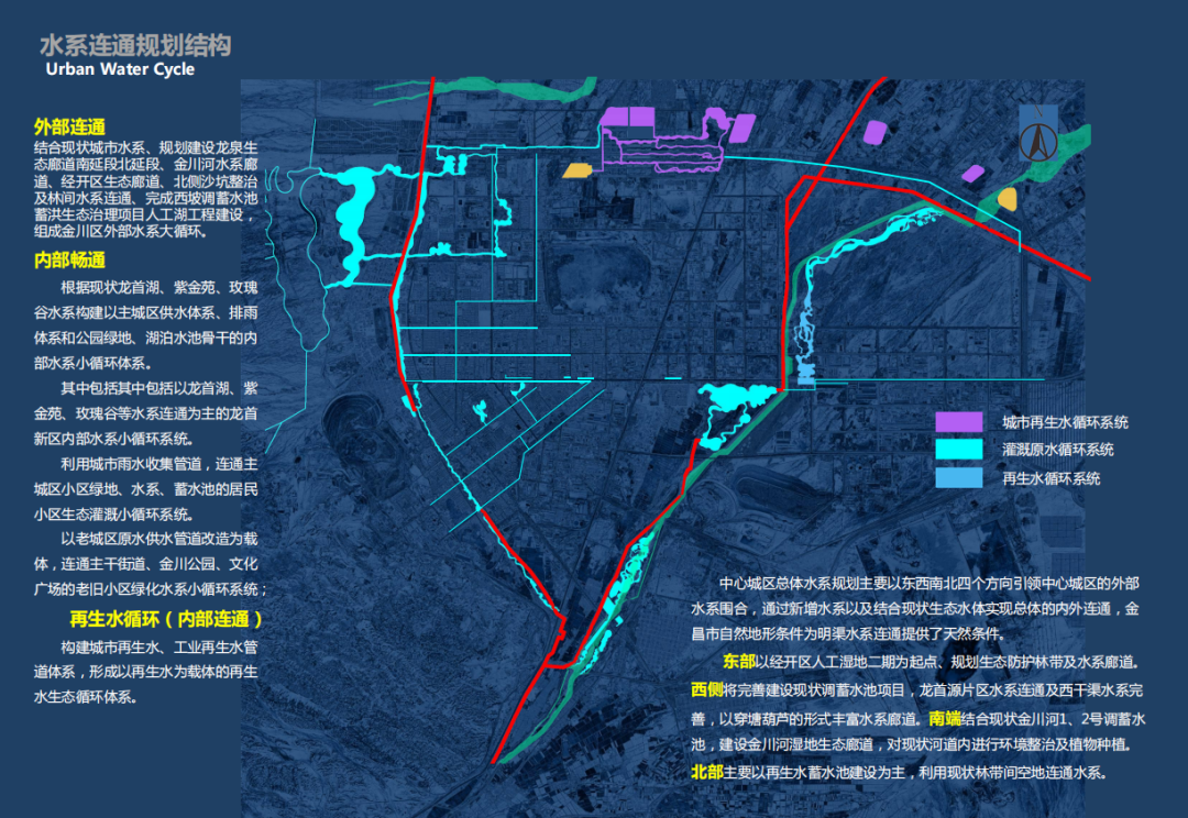 该项目规划建设龙泉生态廊道南延段北延段、金川河水系廊道、经开区生态廊道、北侧沙坑整治及林间水系连通,完成西坡调蓄水池蓄洪生态治理项目人工湖工程建设,组成金川区外部水系大循环,实现“外部连通”;根据龙首湖、紫金苑、玫瑰谷水系现状,构建以主城区供水体系、排雨体系和公园绿地、湖泊水池骨干的内部水系小循环体系,实现“内部畅通”;构建城市再生水、工业再生水管道体系,形成以再生水为载体的再生水生态循环体系,实现“内部连通”。