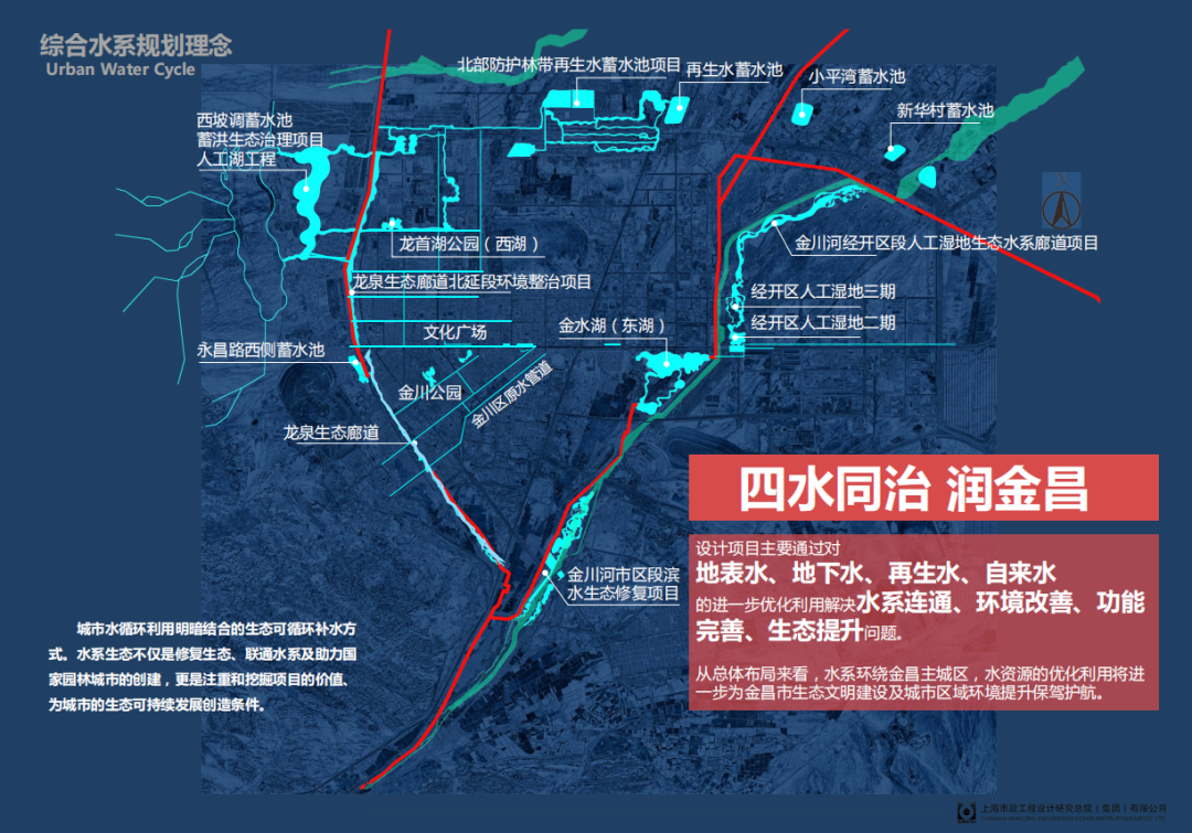 综合水系连通项目是在结合我市城市生态环境建设的短板弱项基础上,对城市水资源进行全面梳理和分配,进一步提高水资源利用效率的重大工程。项目依托金川河水系和穿越市区的工农总干渠和西干渠,通过增加调蓄设施、明渠连通、暗管疏导等手段,连通主城区已建成生态水系、城市公园、绿地林带等,形成“一水、三带、六水系”的环城区水生态保护圈。其中,“一水”指金川河水系;“三带”指龙泉生态带、北部生态水系带、金川河生态林带;“六水系”指西坡调蓄池、龙首湖水系、再生水蓄水池、经开区生态水系、金水湖、金川区调蓄水池。