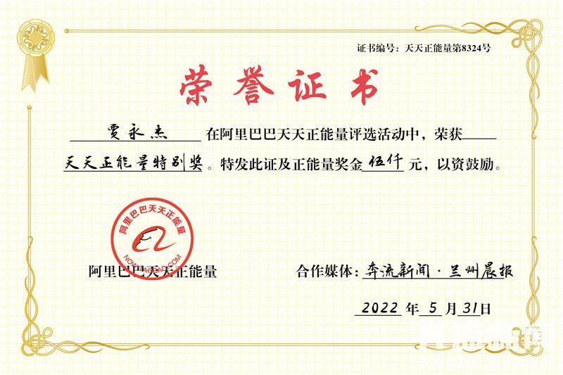 授予贾永杰天天正能量特别奖及5000元正能量奖金