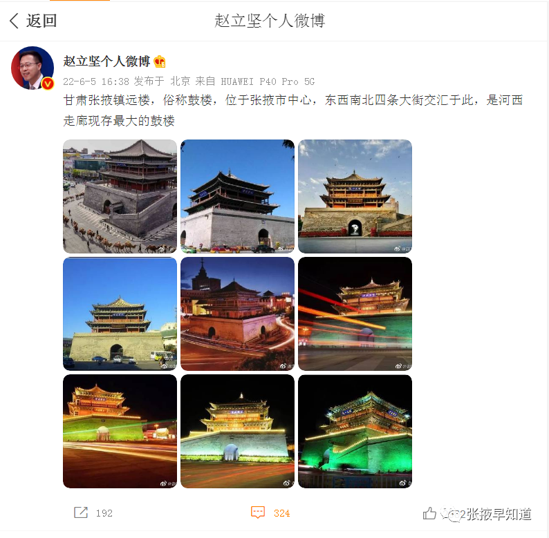 6月5日,中国外交部发言人赵立坚个人微博账号发了一条微博“甘肃张掖镇远楼,俗称鼓楼,位于张掖市中心,东西南北四条大街交汇于此,是河西走廊现存最大的鼓楼”。