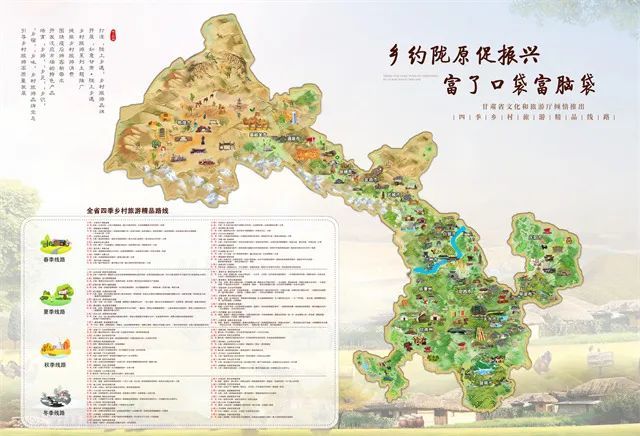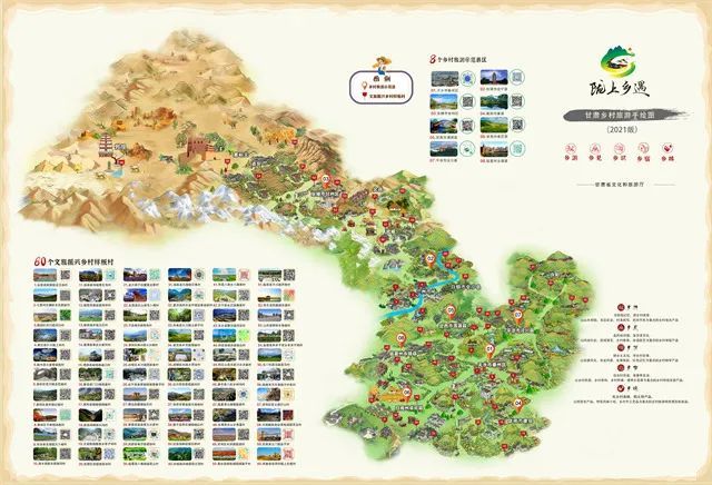 为推介甘肃省乡村旅游资源,讲好乡村旅游故事,甘肃省文化和旅游厅适时设计印发甘肃乡村旅游手绘图(2021版),手绘图以“相约陇原促振兴·富了口袋富脑袋”为主题,突出“图文并茂、服务游客、便于携带、适于珍藏”等特点,对2021年创建的8个乡村旅游示范县,60个文旅振兴乡村样板村全部开发设计了电子“二维码”,设置了甘肃省乡村旅游60条四季精品线路,以亮丽、活泼的色彩和卡通的形式生动形象地展现了甘肃乡村旅游特色元素和资源产品信息,对于帮助游客畅游甘肃乡村、感知陇原文化、体验乡村魅力具有重要意义。甘肃乡村旅游手绘图计划“十四五”时期连续推出5版,全方位、多角度涵盖展示甘肃乡村自然风光、风俗民情、历史风貌以及特色景区、地方美食、当地特产、精品线路、非遗文化等信息内容,最终打造出“陇上相遇”乡村旅游全景图。