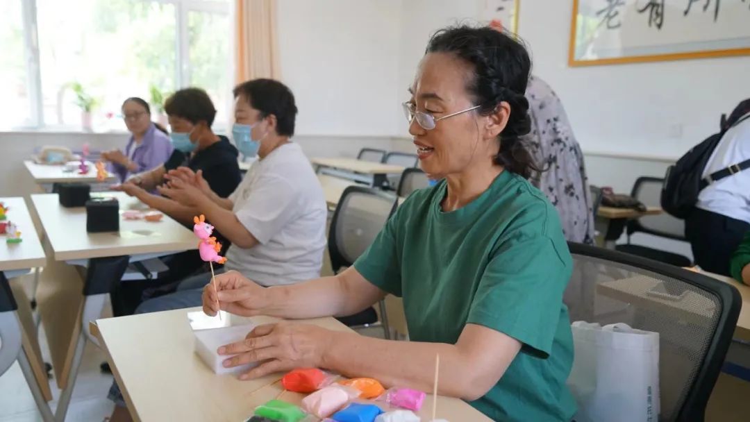 当日上午,社区老年大学正在上生动有趣的手工课,十余名老年人坐在教室里认真听讲。在老师的指导下,大家用彩泥捏出各式各样憨态可掬的小动物,手工制作的乐趣和成就感让每个人脸上都洋溢着笑容。