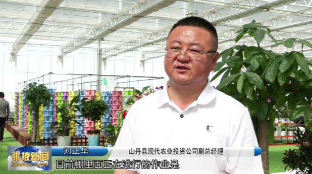山丹县现代农业投资公司副总经理 刘正华:“目前棚里面正在进行的作业是水培、机质培的植物移植栽植工作,品种有芹菜、香菜等十多种品种,同时我们从云南、广州进了一批花卉,正在摆放中。”