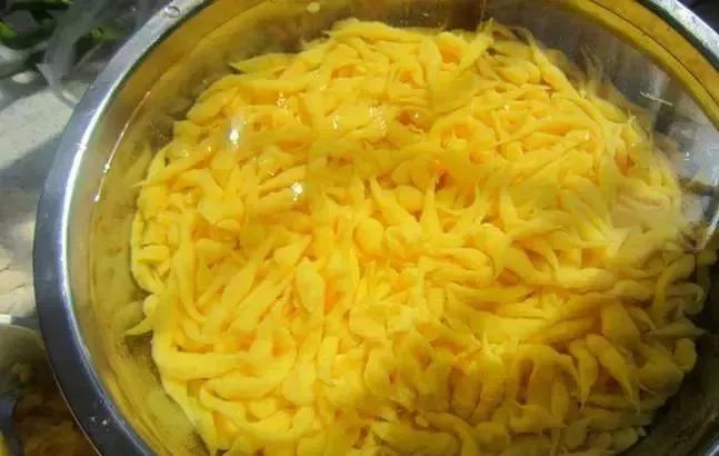 用漏勺打着圈刮下来的长条形的叫“捞捞”,沿着边缘用刀削下来的叫“削削”。