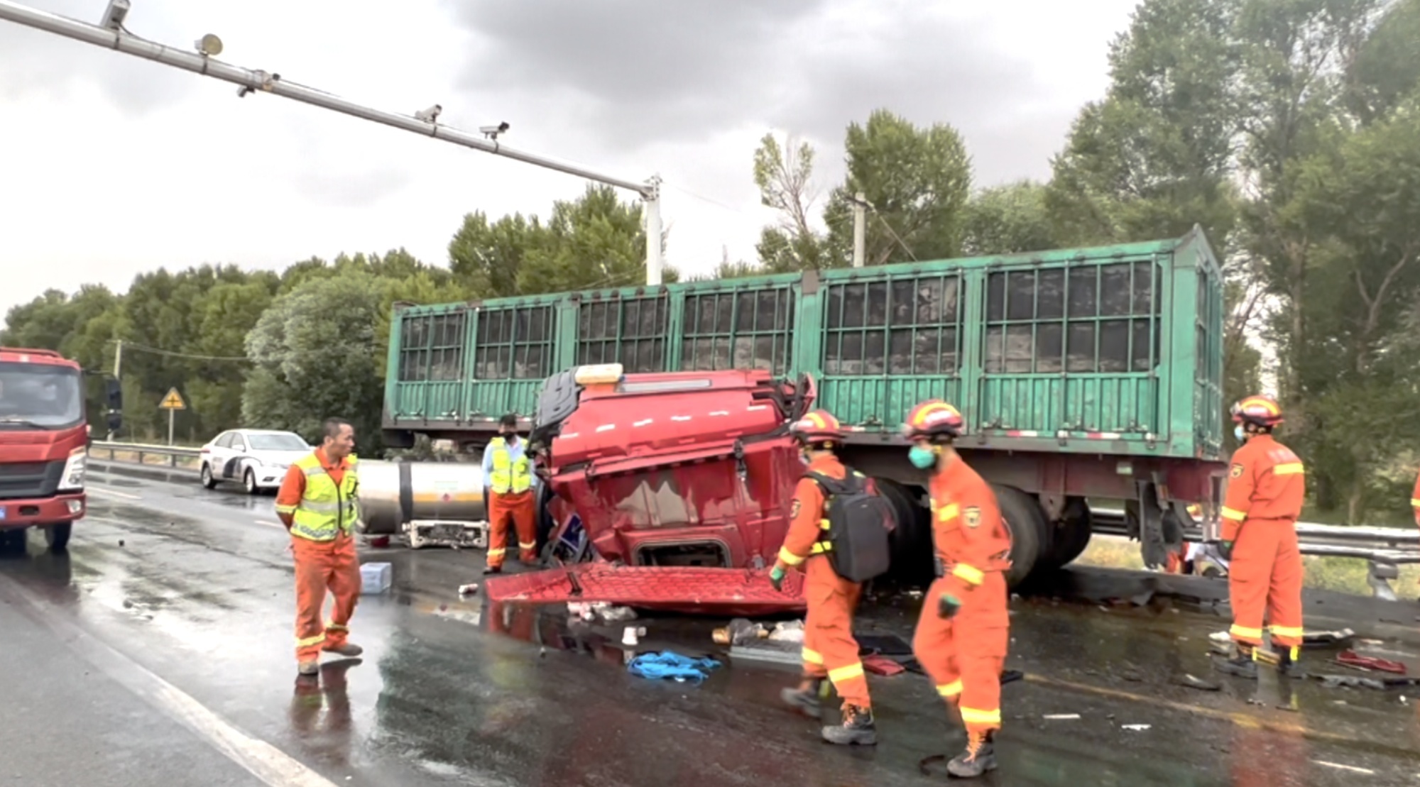 6月26日6时48分,在312国道甘肃玉门3128公里加60米处,一辆满载33吨原油的重型危化品槽罐车因车速过快,加之雨天路滑,与相向行驶的一辆重型半挂车相撞,导致2车严重受损2名驾驶员被困。