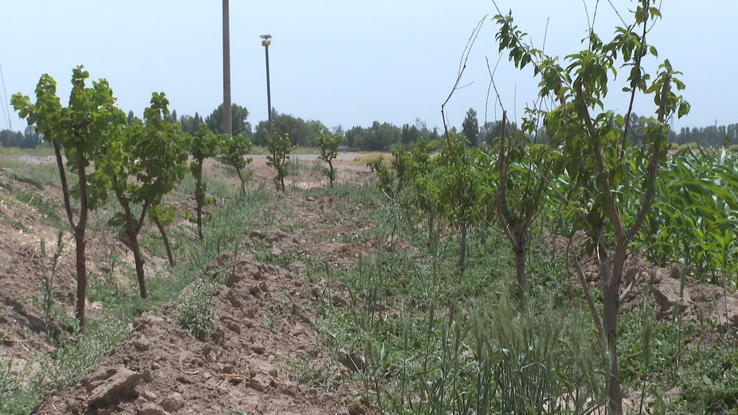 下汤村一社村民马福政正在地里忙碌着,在他身后的桃林中,部分果树已经挂果,枝头的油桃更是惹人喜爱。