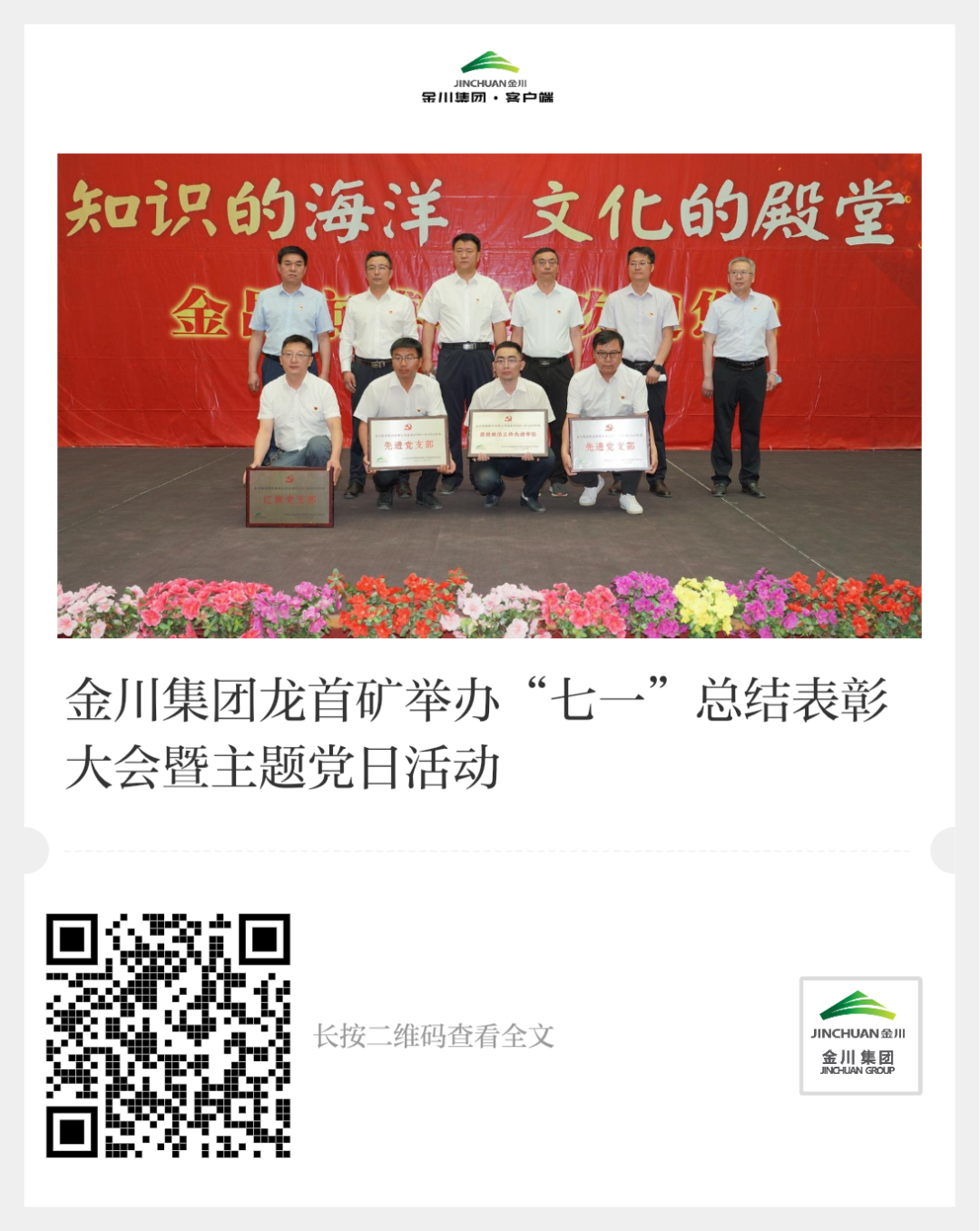 为热烈庆祝中国共产党成立101周年,回顾党的光辉历史和丰功伟业,金川集团各单位陆续开展庆祝建党101周年暨“七一”总结表彰大会,表彰近一年来在工作岗位上表现优异的基层党组织及党员干部职工,希望广大干部职工向他们学习,勇担使命、创新创效、破解难题,奋力开创金川高质量发展新局面。