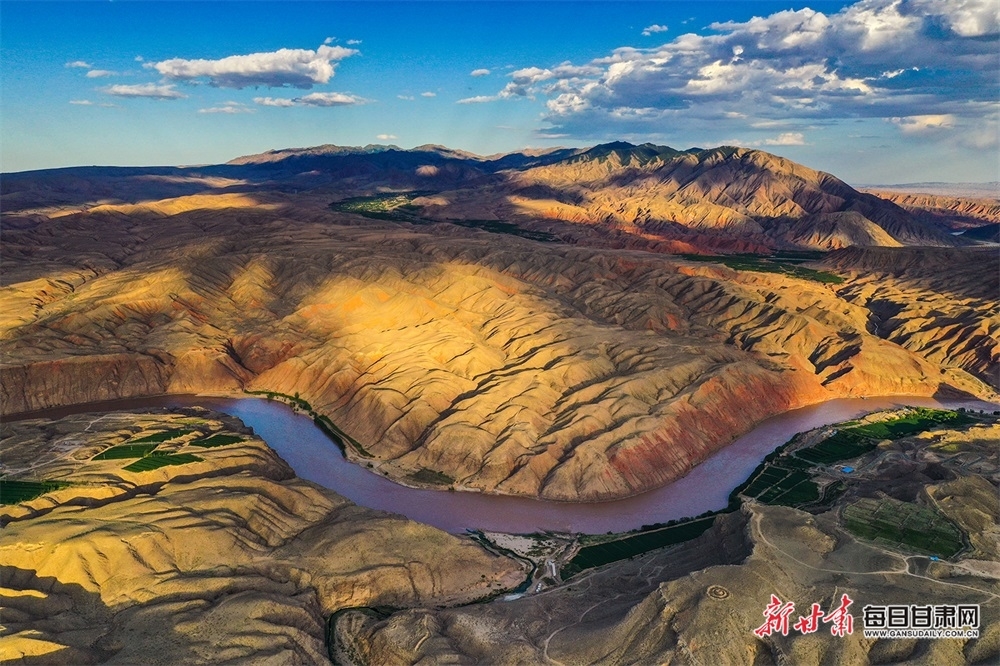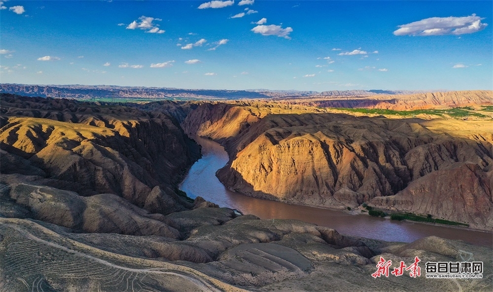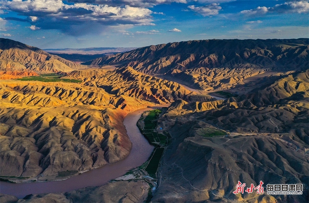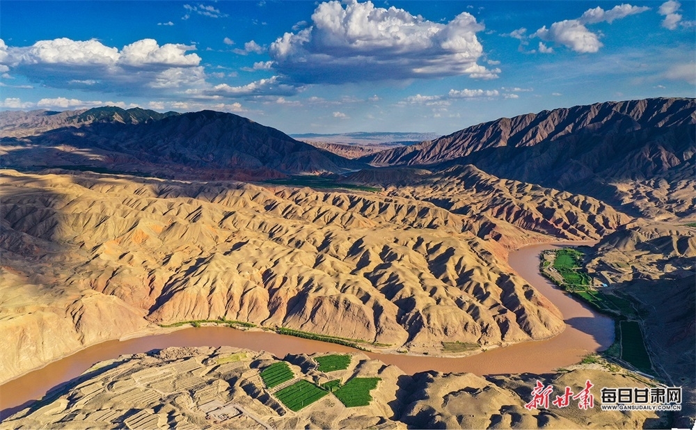 九曲黄河十八弯,黄河在进入甘肃景泰境内的黑山峡之前,穿行于索桥古堡这个汉、明时期丝路咽喉通道的红山峡谷地带,蜿蜒逶迤,在仲夏时节的云景和夕阳的陪伴下,在金黄色的山峦间,色彩斑斓。