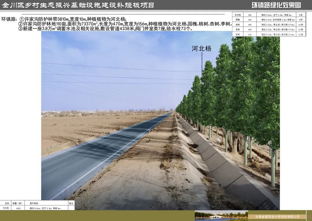 金川区乡村生态振兴基础设施建设补短板项目系市列重点项目,计划分四期建设,主要对古金路、环镇路、天高路等5条道路防护林采取原迹地采伐更新改造的方式进行绿化,对两镇19个村组退化的农田林网进行提升改造,在适宜的位置规划营造新的农田防护林网,对新建农宅、小广场等进行绿化美化,清理新疆杨、榆树、沙枣等枯死树木,新栽植河北杨、沙枣、国槐、海棠、太阳李等绿化苗木34.6万株,配套建设6座蓄水池及灌溉设施。