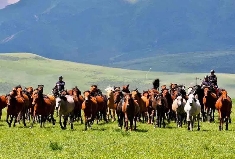 7月5日,盛夏时节,祁连山北麓的山丹马场绿草如茵,牧马人策马扬鞭,奔跑的马群现万马奔腾美景。