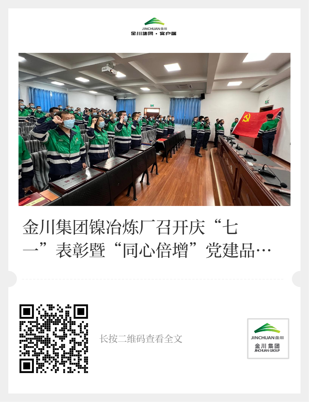 金川集团镍冶炼厂召开庆“七一”表彰暨“同心倍增”党建品牌发布会。会议进行了新党员入党宣誓,老党员重温誓词,表彰了一年来涌现出的先进集体和个人。