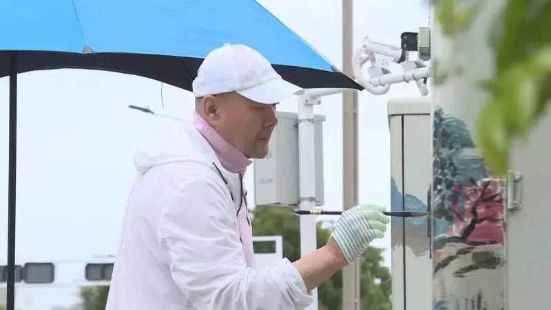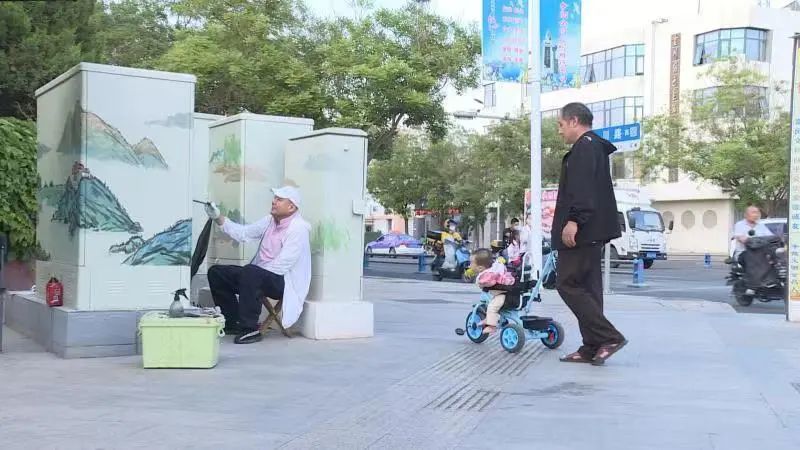 这位画家叫王大庆,今年58岁,最近一个月,他每天早上5点多起床,晚上10点左右回家,从公园路、北京路、永昌路再到贵阳路,现在已经完成了100多个通信光缆交接箱箱体画作。