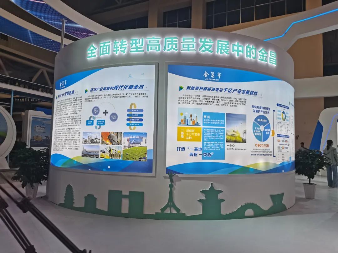 绿色发展、无限“金”彩。走进金昌展馆,白色主基调的大厅明朗大气、主题鲜明,新能源电池、钙钛矿薄膜、元生绵羊奶等产品一一呈现。展馆以“全面转型高质量发展中的金昌”为主题,对我市的特色优势产业、名优特色产品、重大项目建设等进行宣传推介、展示展销,展示内容、手段上突出简洁、现代和务实。