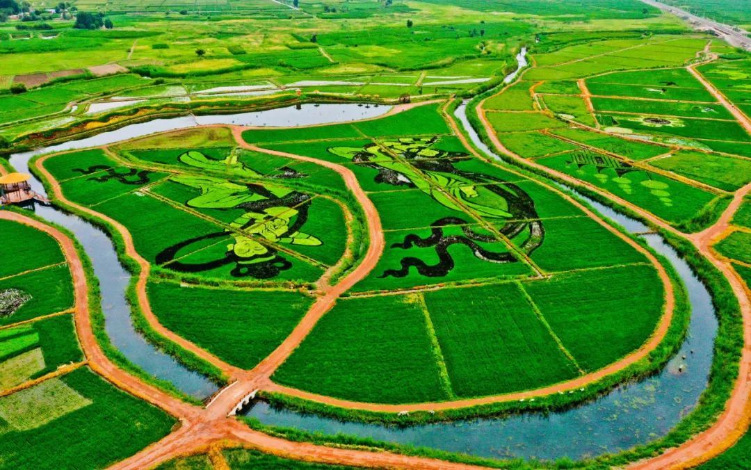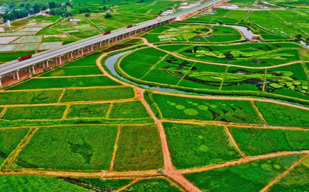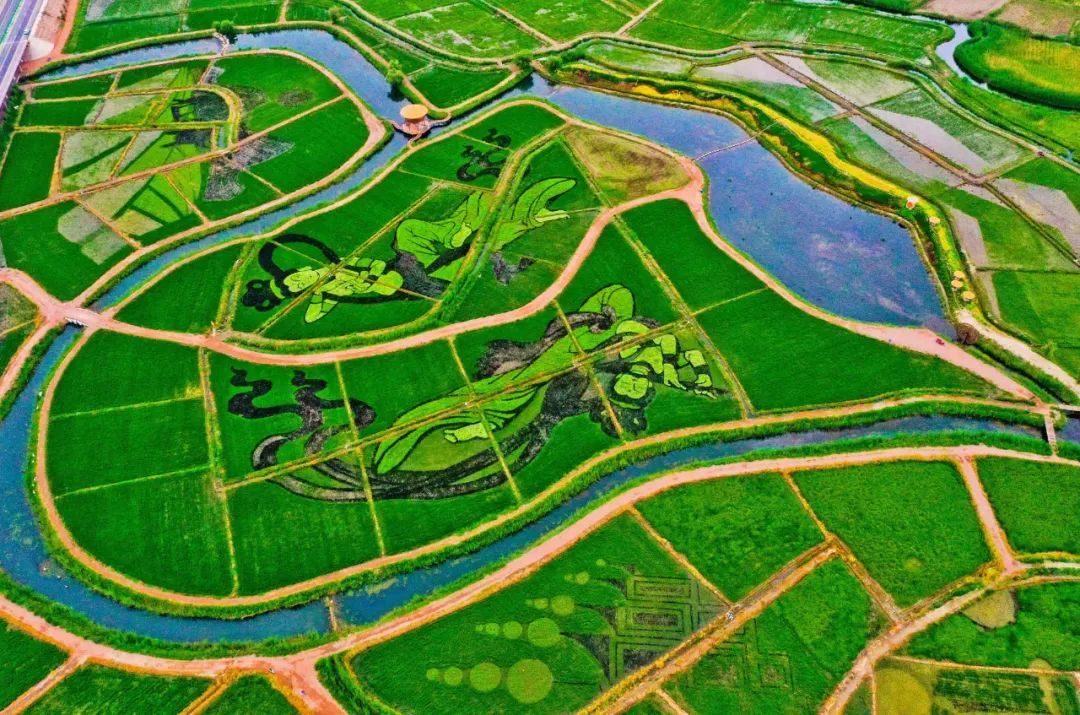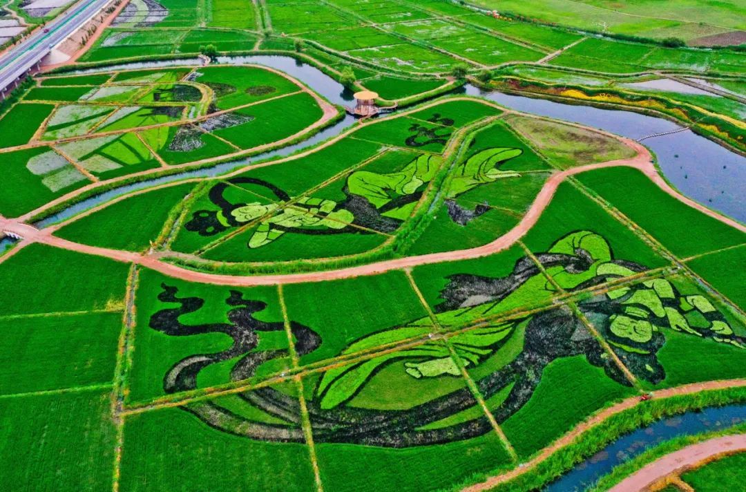7月13日清晨,一场小雨过后,朝阳照射在甘州区乌江镇新河田园综合体稻田景观区内,一幅幅彩稻田画栩栩如生,俯瞰稻田,田园风光和生态美景展现在人们眼前。