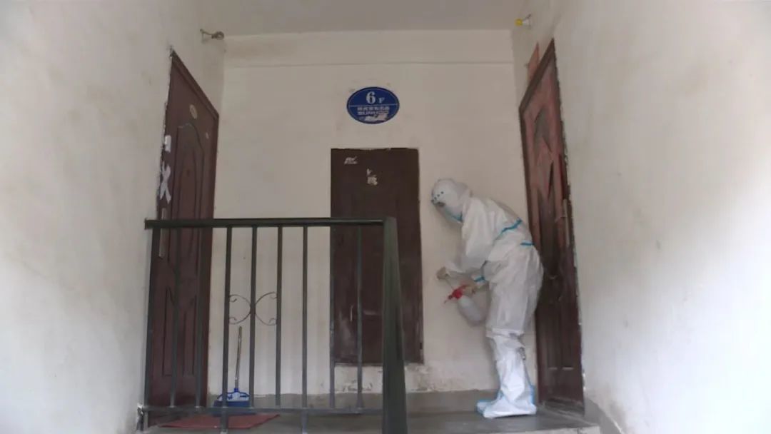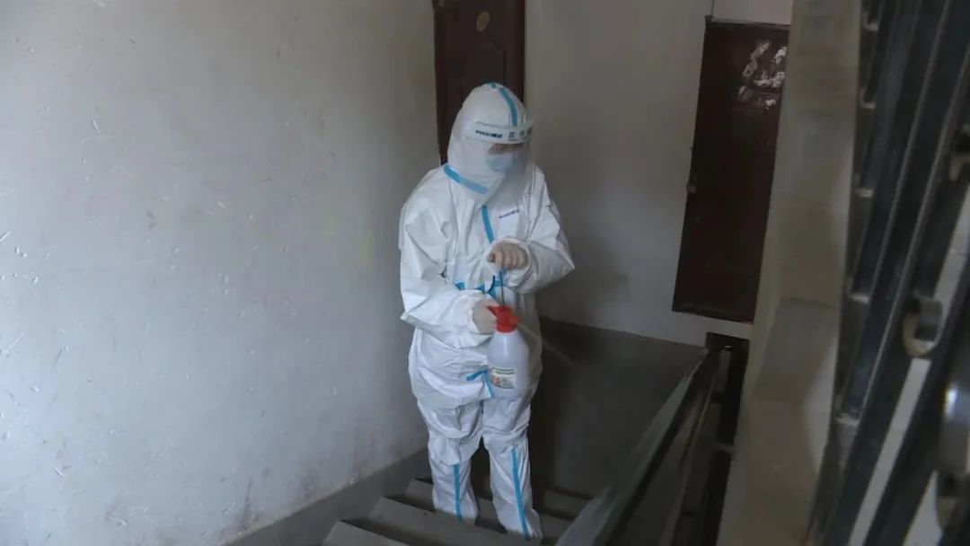 每天我们来这里消杀扶手楼梯两次,顺便看看门禁封条是否完好,居民有需要的物资给我们打电话,我们去帮忙购买,给他送到家里,保证他这几天的生活物品的需要。