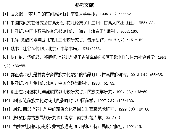 综上所述,花儿是多民族民歌融合的产物,具体来说,羌族民歌是其母体,古鲜卑人民歌、匈奴人民歌、吐蕃人民歌和蒙古族民歌都给它注入了新鲜血液,它是多民族民歌联姻的“混血儿”,正因为这样,花儿才既有忧伤凄婉之风,又有欢快明朗之调,才能在不同地区、不同民族中广泛流传。如果要从时间上做一界定的话,那么秦汉时期是花儿的萌芽期,魏晋南北朝至元代是其发展期,明代是其成熟期。