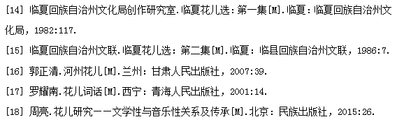 明代中叶时,花儿已经成了一种多民族共同传唱的民间音乐艺术,歌词中经常出现的“十三省”(如“十三省的家什找完了,找不见菊花的碗了;清茶哈熬成个牛血了,茶叶哈滚成个纸了;双手拉端上者不接了,阿塔些得罪下你了。”[16])就被多位学者认为是明代花儿的印记。在目前整理出来的花儿曲令中,“汉族花儿常引用《封神演义》《三国演义》《隋唐演义》《水浒传》《包公案》《杨家将》等历史故事或神话传说作为起兴的内容”[17],保安族有《保安令》,东乡族有《东乡令》,撒拉族有《撒拉令》,土族有《土族令》,回族花儿歌词中多穿插阿拉伯语和波斯语[18],藏族花儿歌词中会时不时地出现一些古藏语倒装句。