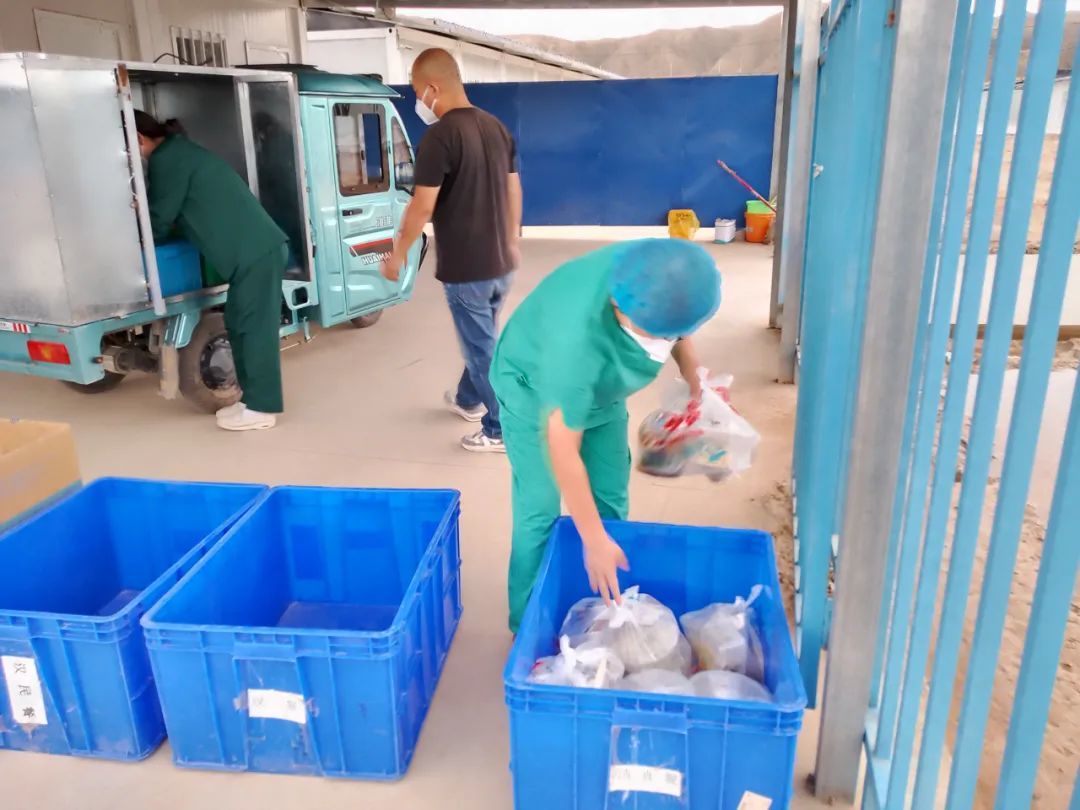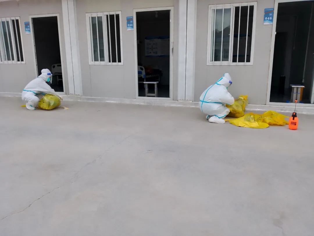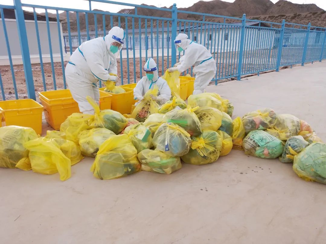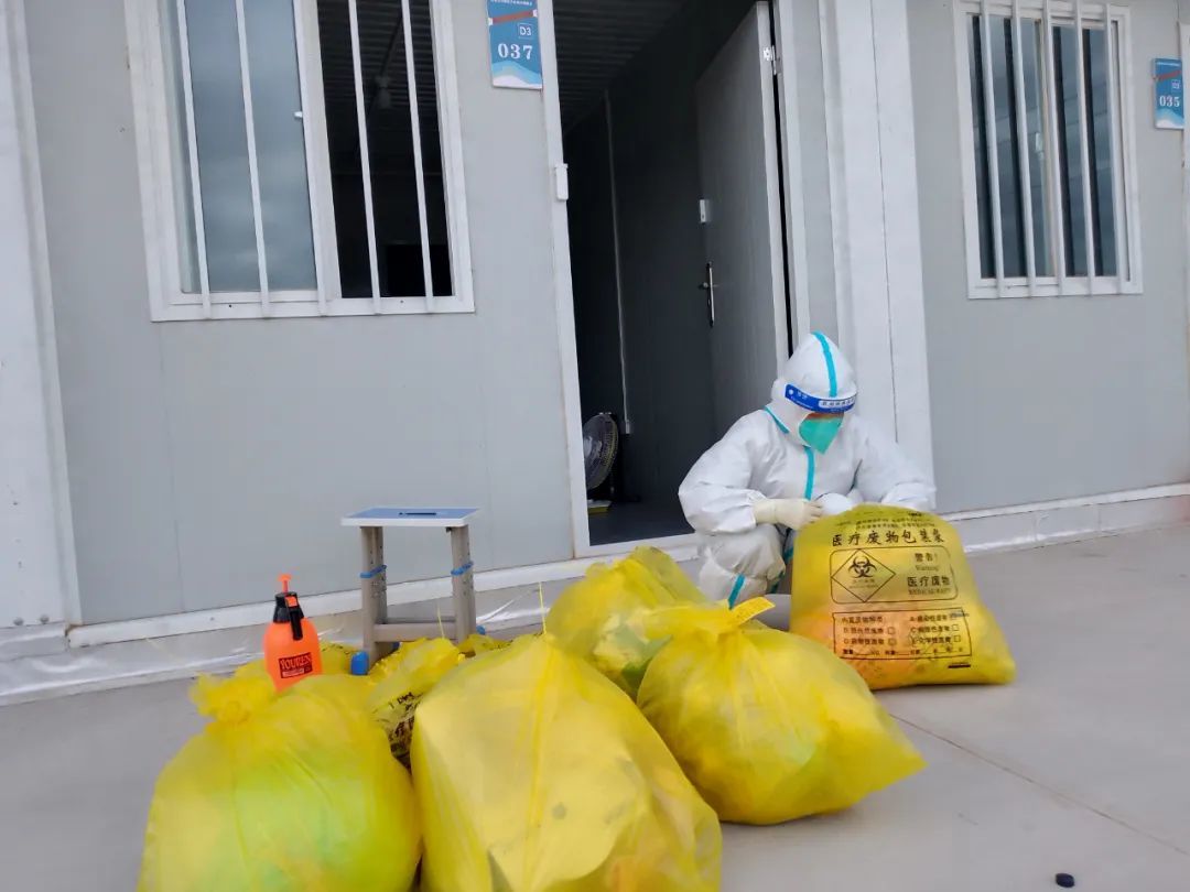 下午13时30分,午餐还来不及消化,大量的工作又堆积如山,为保证隔离点环境卫生整洁,工作人员顾不上片刻休息又开始清理生活和医疗垃圾,工作人员每天都会先将垃圾装入双层医疗垃圾袋,经过严格的处理后,再放入指定位置。