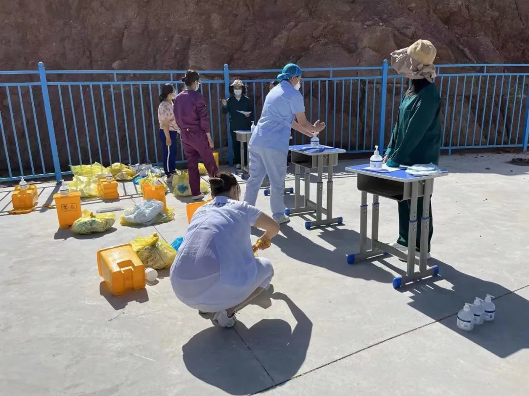 内点一共有十一个区,医护人员分为十个工作小组,每组五名工作人员,早上六点进舱准备,六点半开始采集核酸。