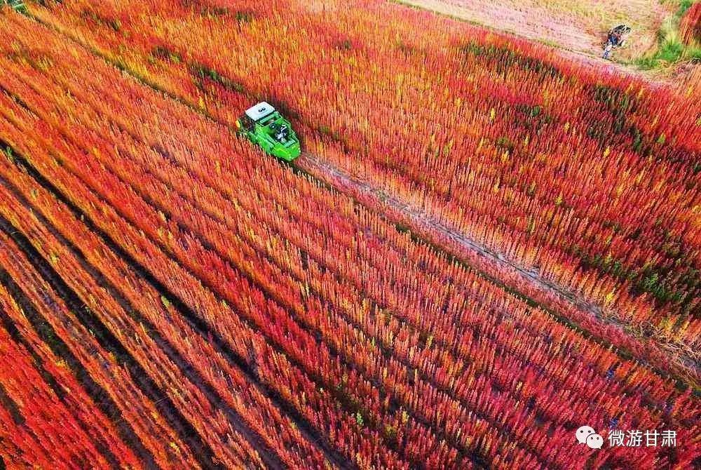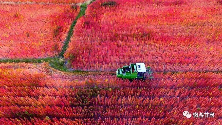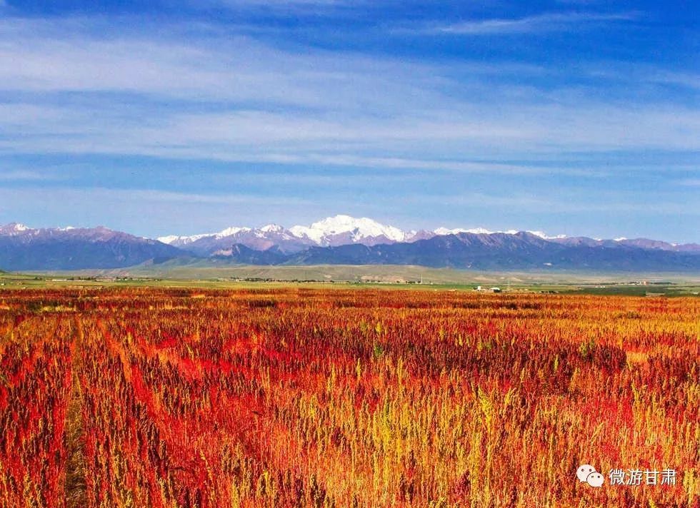 秋季的时候,在连霍高速公路旁就可看到祁连雪山下一片片红艳艳的藜麦胜景。