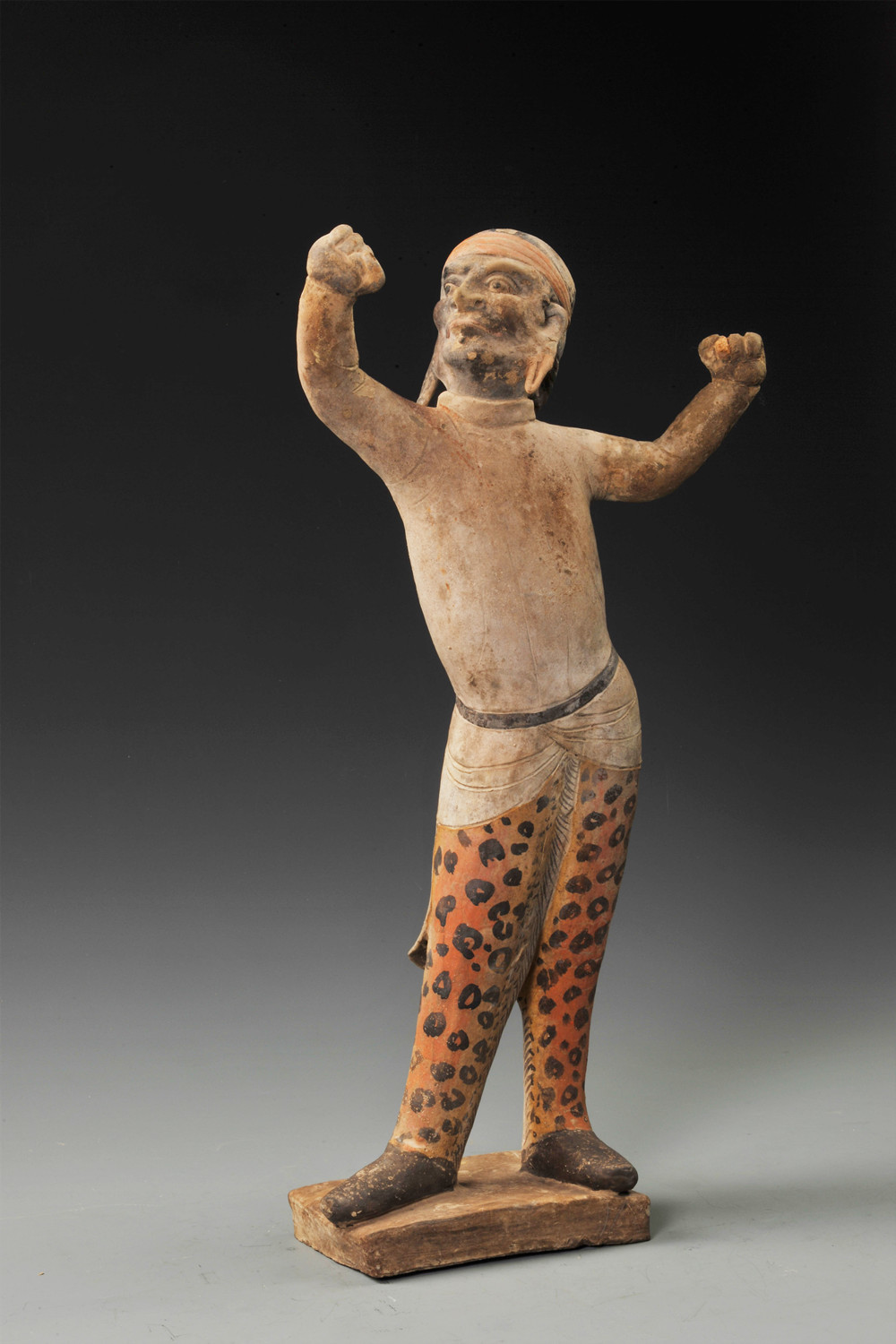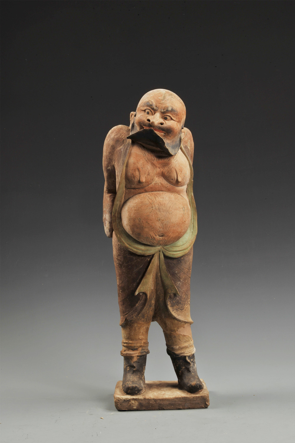 而另一尊彩绘灰陶袒胸胡人俑,则是一位身着胡服,高鼻梁、大鼻子、络腮胡须呈铲形、袒胸露腹的豪迈胡人大汉。他双目圆睁,神态嗔怒,双手置于身后,似笑非笑,表情诡异。有学者认为是这尊胡人俑在表演神奇而惊悚的幻术。