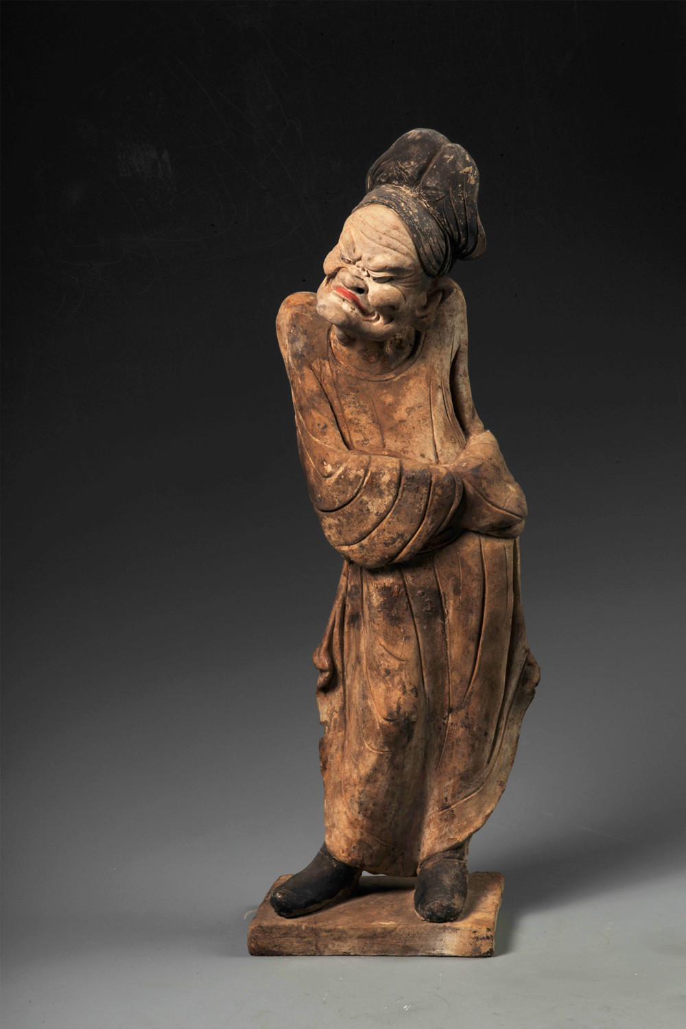 作为随葬品的胡人俑,生动再现了丝绸之路上外国人来华的盛况,再看另一尊胡人俑——彩绘灰陶参军戏俑,高帽和衣襟处皆有朱色花纹,他高鼻深目,胡须浓密,一目圆睁,一目微闭,口唇涂朱,露出牙齿,这笑容不像大唐一人俑,倒像生动立于你面前一活人,面部表情生动,意味悠长……