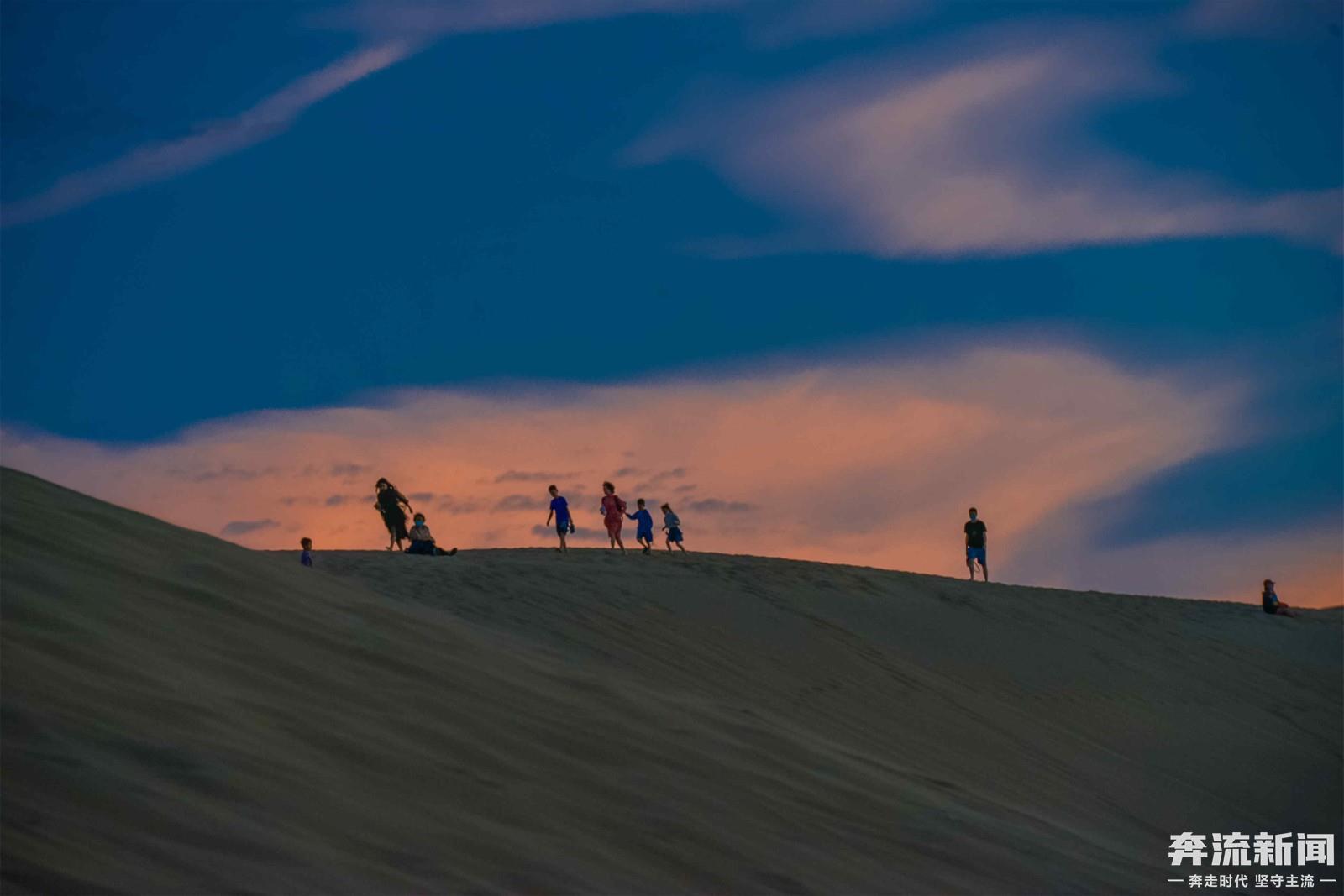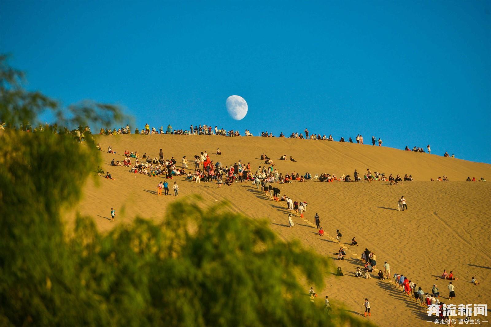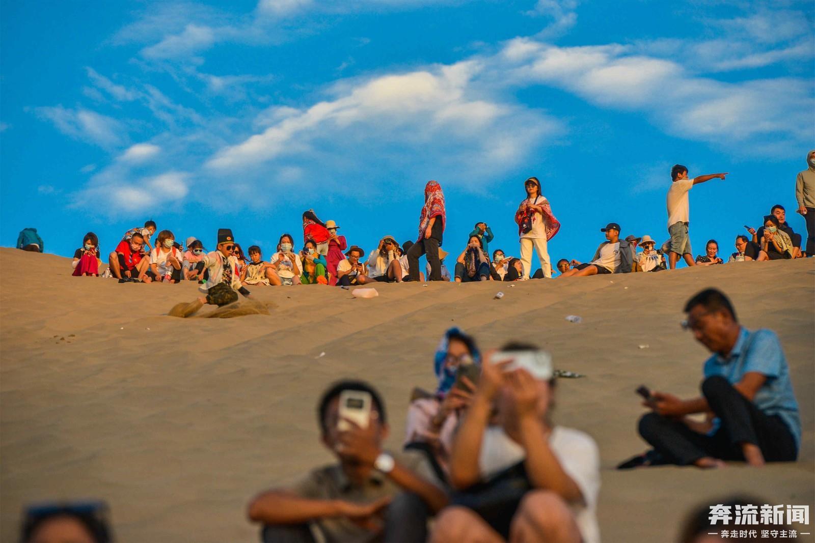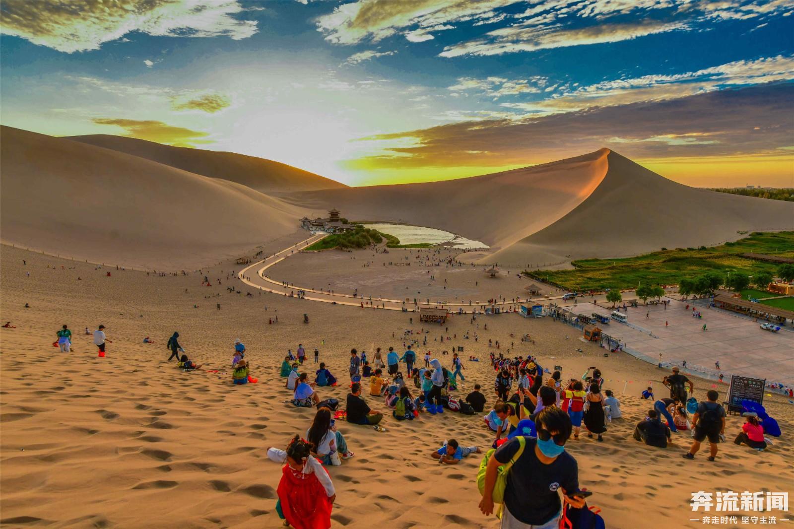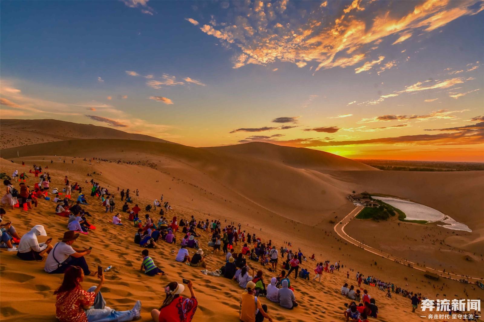8月份以来,连续几场小雨,滋润了敦煌大漠。立秋后的敦煌天气凉爽,大批游客登上鸣沙山,赏落日余晖。