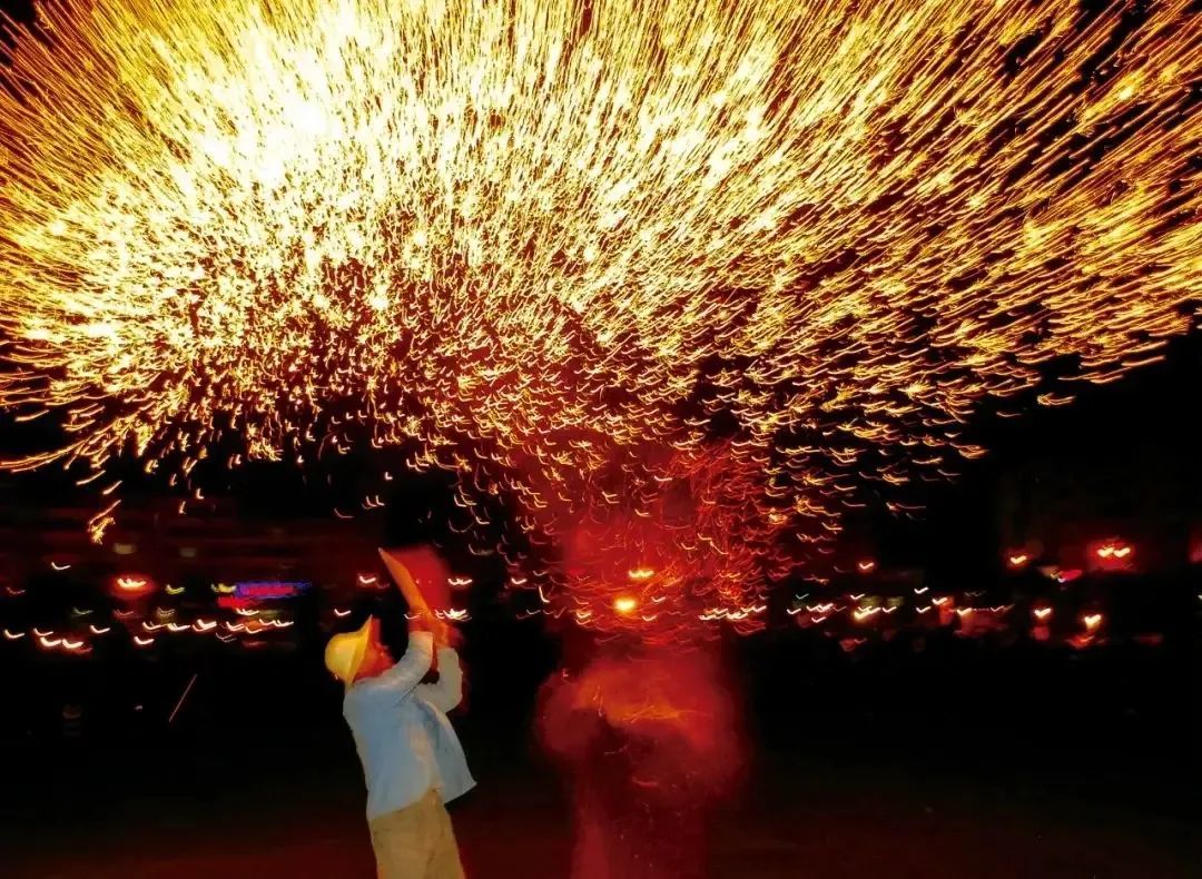 夜幕下,几名壮汉手持木板,将刚刚出炉的炽热铁液迅速地洒向天空,顿时,铁花四溅,一幅幅富有吉祥意味的“天女散花”“鸿运当头”等绚烂夺目的画面展现在人们眼前,美如金菊、牡丹盛开,抑或是彩蝶翩跹……